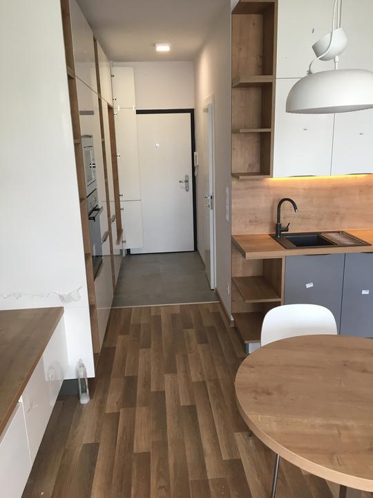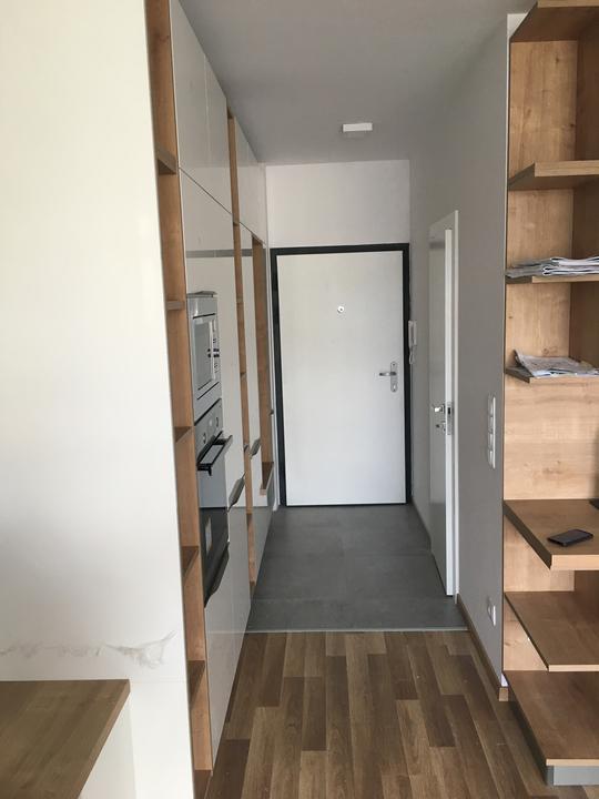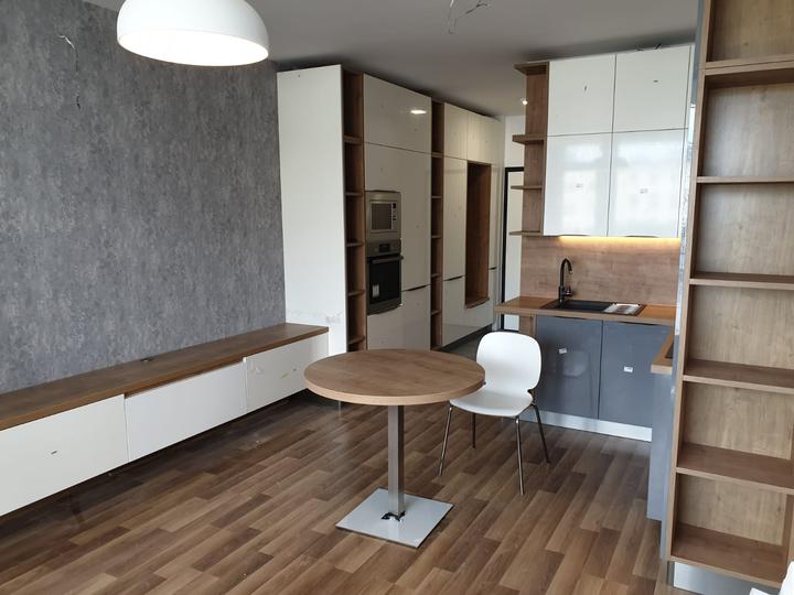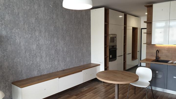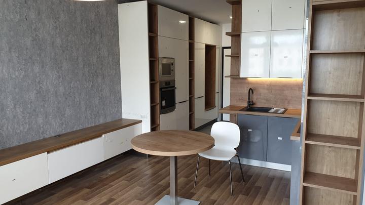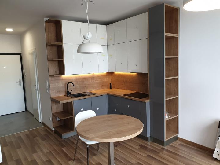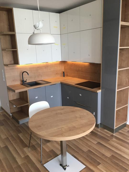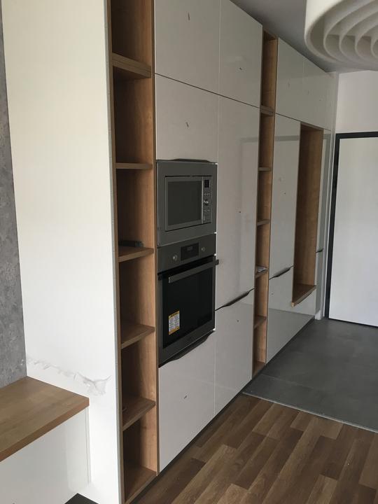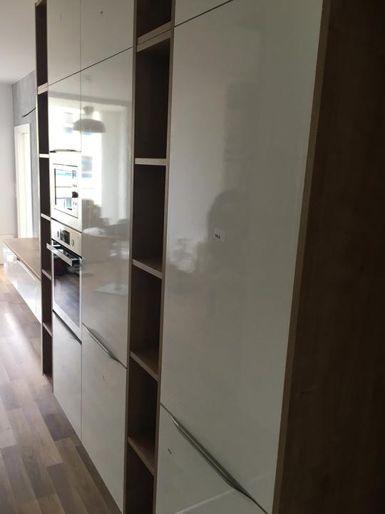 kompaktná realizácia bytu o rozlohe 58 m2. Predsieň, kuchyňa a obývačka navrhnutá z kombinácie dekoru GALA a push systému CORA v prevedení ivory vysoký lesk + šedá vysoký lesk. Korpus v prevedení vanilka. Pracovná doska + zástena, ako aj poličky a r…