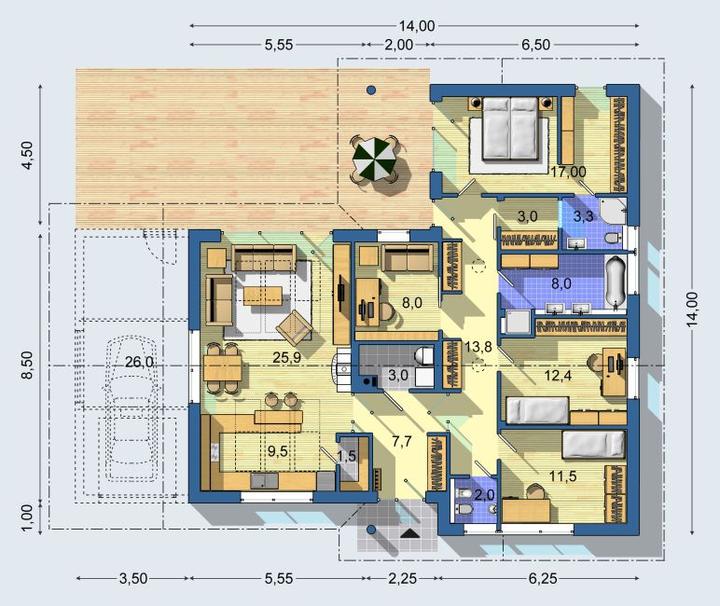 Bungalov 1372 je stredne veľký dom, ktorý dostatočne uspokojí nároky 5 - člennej rodiny.