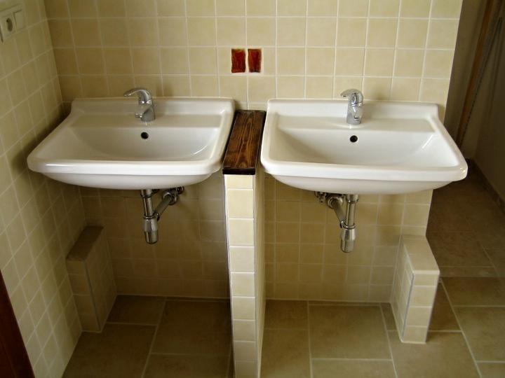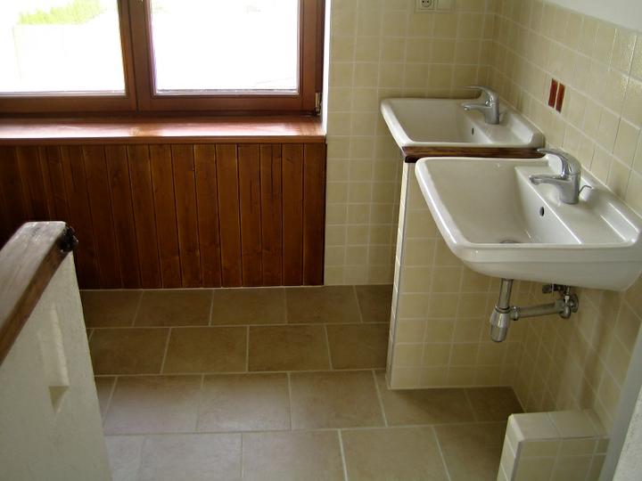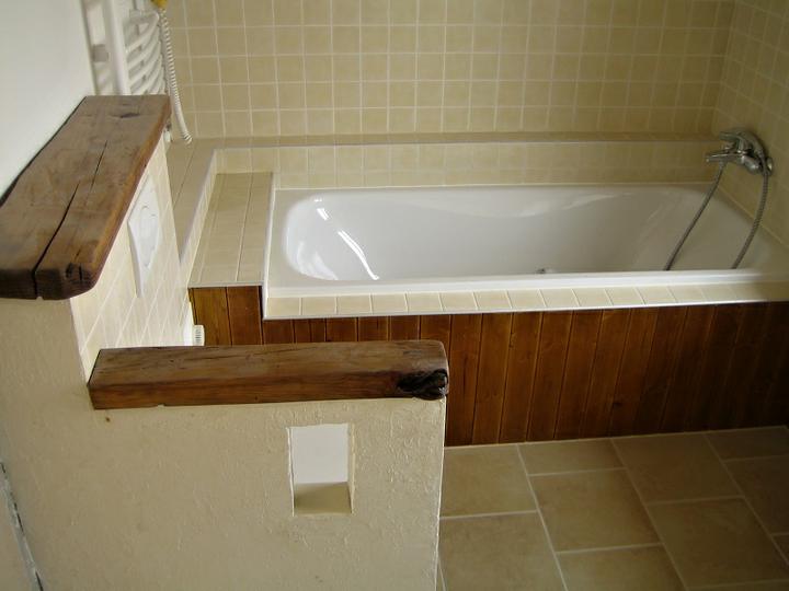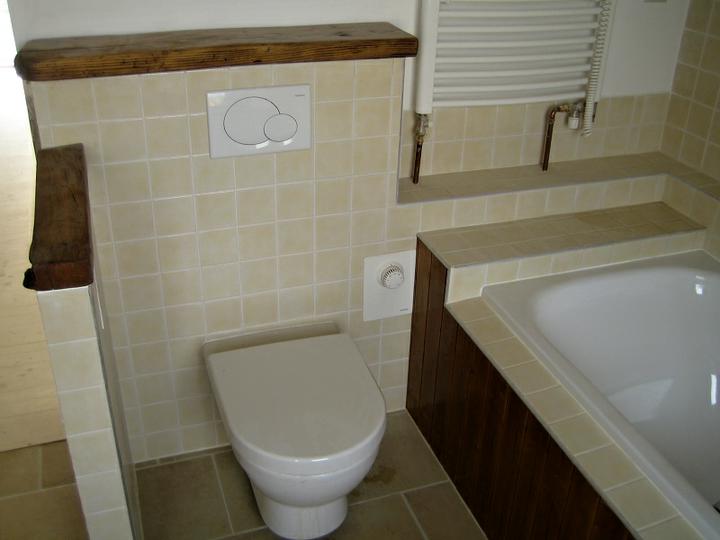 Krásny príklad kombinacie dreva v kupelni Kompletné vybudovanie kúpeľne v rodinnom dome v Grobe. Siete + obklady , dlažby, zariadenie, drevený obklad vane a steny, stierky a maľba.