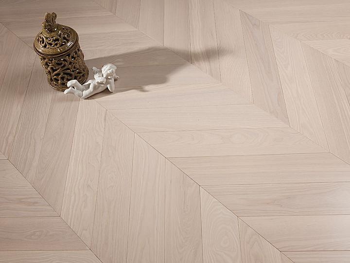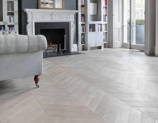 francúzsky Chevron vzor z parkiet ktoré sú rezané pod 60 st. uhlom vytvára nádherný dizajn. Momentálne je tento typ ukladania veľmi trendy, hodí sa k modernému interiéru, pôsobí luxusne a zároveň tradične. Je mimoriadne obľúbený v kombinícii s shabb…