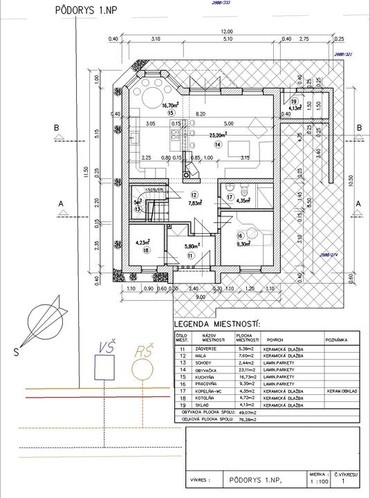 Prízemie: zádverie, hala, obývacia izba, kúpeľňa+WC, kuchyňa, pracovňa, kotolňa, sklad