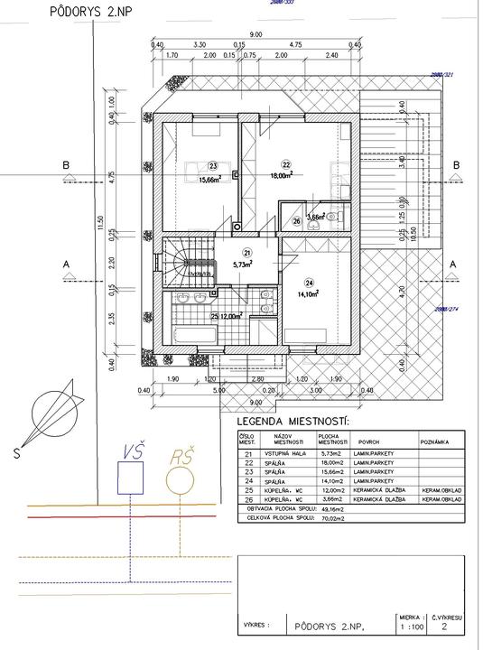 Podkrovie: vstupná hala, 3x izba (hlavná spálňa s kúpeľňou), 1x kúpeľňa, balkón so vstupom z hlavnej spálne