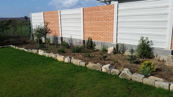 august - fasáda na plot pred domom, postupne dovážame zem na vyrovnaie zadného dvora