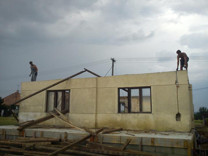 august 2011 - drevo na strop a strechu objednané, ťaháme poschodie, murujeme garáž