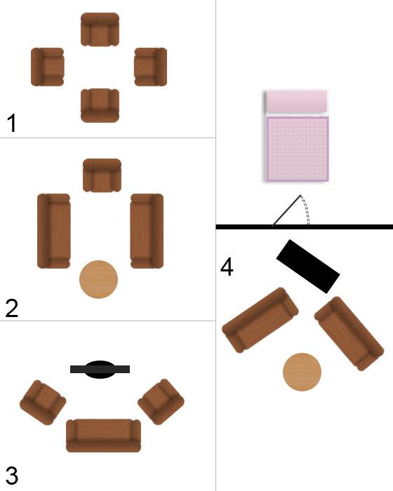 Rozloženie nábytku záleží od veľkosti obývačky. Ak je napríklad malá obývačka prepchatá ťažkým a tmavým nábytkom, mohlo by dôjsť k blokovaniu toku čchi. Pre veľké obývačky sa odporúča aby boli optický rozdelené nábytkom alebo rastlinami. Nábytok rozmiestňujte tak, aby jeho hrany nemierili na pohovku, vyvoláva to podvedomý stres a nepokoj.