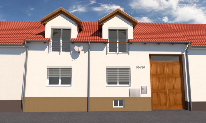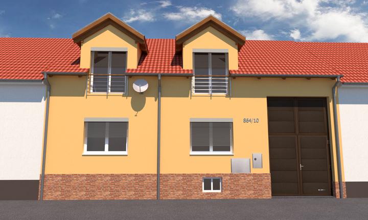 Fasáda rodinného domu v radovej zástavbe je navrhnutá vo viacerých verziách. Farba omietky na fasáde je doplnená o obklad na sokli. Súčasťou okien je vonkajšie tienenie formou exteriérových žalúzií.