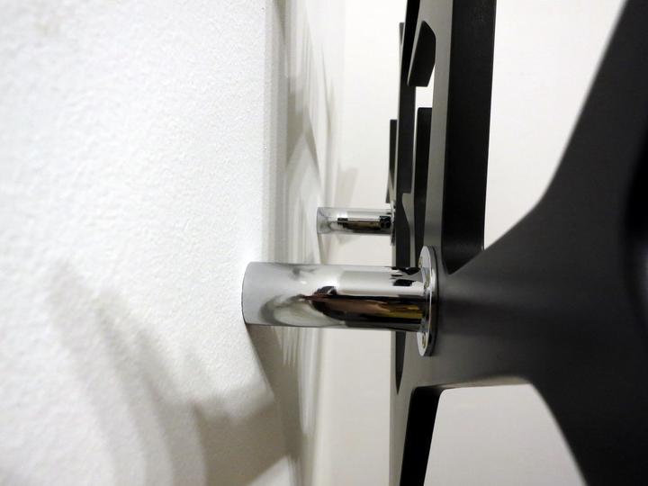 Nastrek je viacvrstvovy polyuretanovy lak, farba polomatna cierna. O stenu som to chcel upevnit kovovymi konzolami. Ale nic co by sa vyrabalo priamo na ten ucel som nezohnal tak mi nejaky cas trvalo kym som nasiel nieco co by sa dalo pouzit, dobre a jednoducho by vyzeralo a zaroven umoznovalo montaz vesiaku o stenu bez toho aby sa museli vrtat diery skrz vesiak.