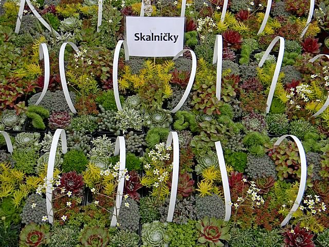 Arabis, Aubrieta, Armeria, Delosperma, Dianthus, Draba, Rosularia, Saxifraga, Sedum, Sempervivum a iné rastliny, podľa sezóny.