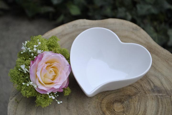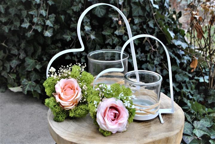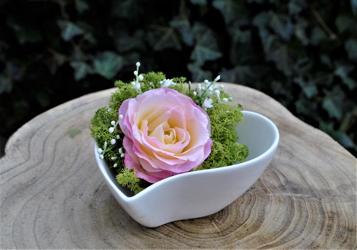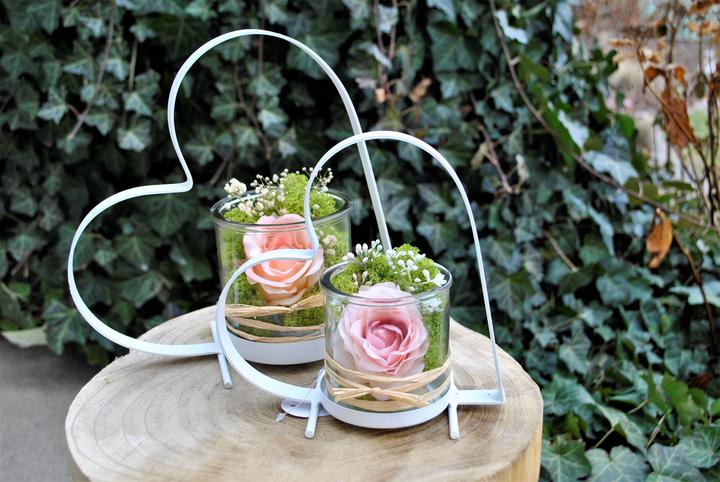 Valentínske srdiečka - aranžmán z hodvábnej ruže a stabilizovaného lišajníka, nájdete v našej ponuke e-shopu