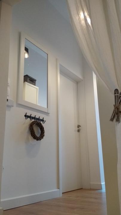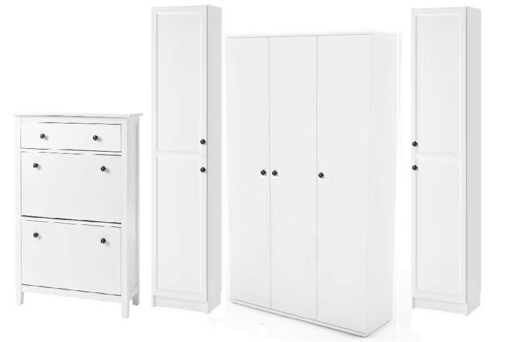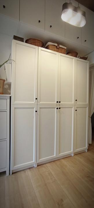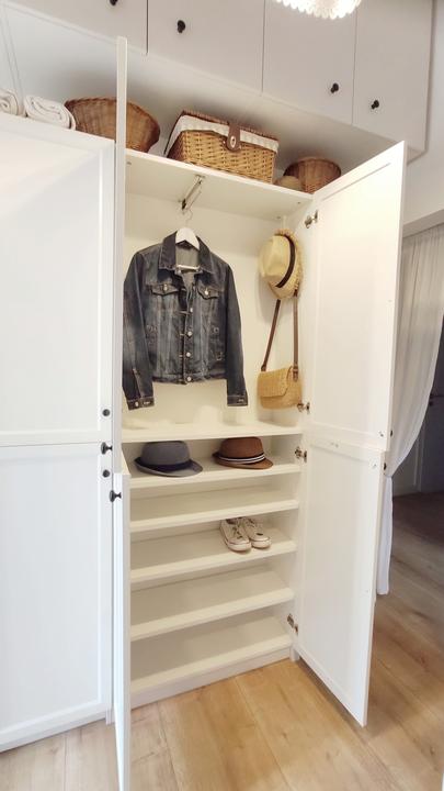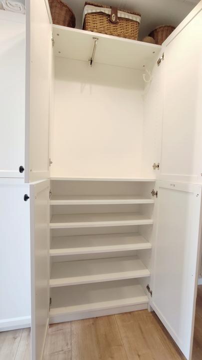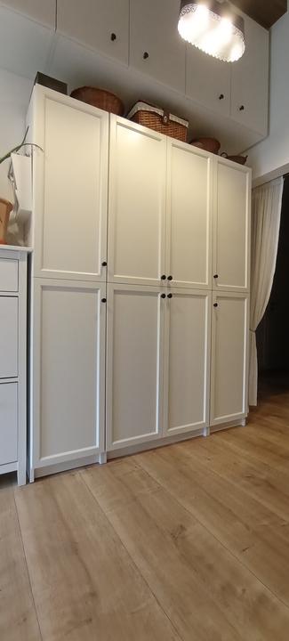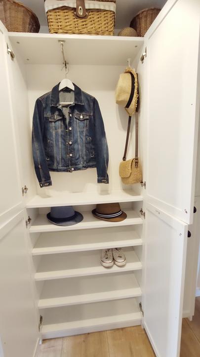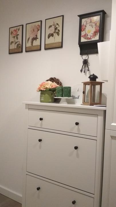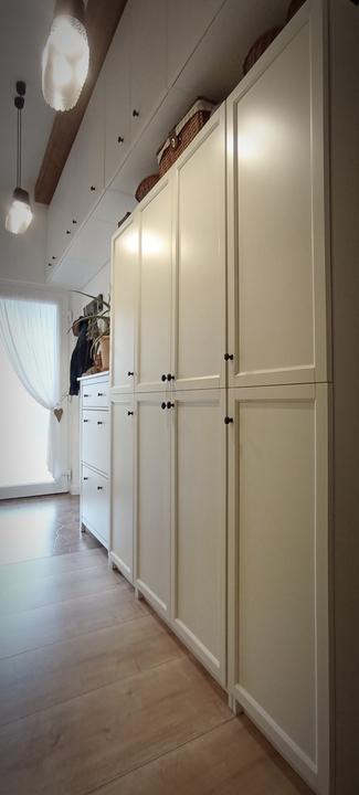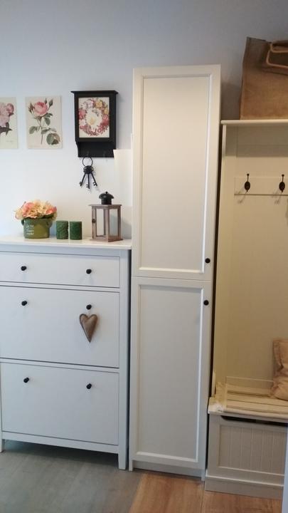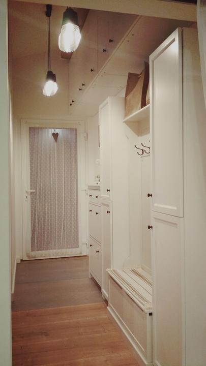 tak predsa len, i keď som nemala v pláne už kupovať nábytky, rozhodla som sa na chodbe vymeniť vešiakovú stenu za jednoduchú, funkčnú skriňu, zháňala som plytkú, max 40 cm, nakoľko je chodba veľmi úzka, no na tej vešiakovej skrini samozrejme v bežných dňoch viseli vetrovky, atď a topánky na poličke oproti ma fakt iritovali, biela je biela a aj keď zaplním vlastne celú ľavú stenu, všetko je v bielej farbe, steny tiež a oproti zostane len tehlová stena so zrkadlom v bielom ráme. Chodba je úzka, široké skrine tam byť nemôžu, hľadala som a našla som, úchytky vymením za čierne :)