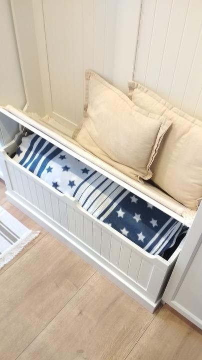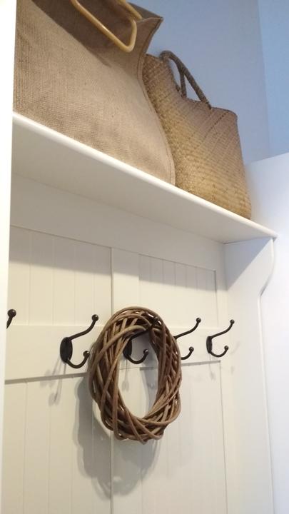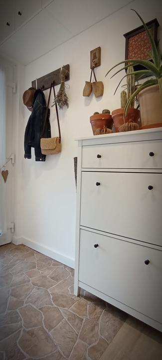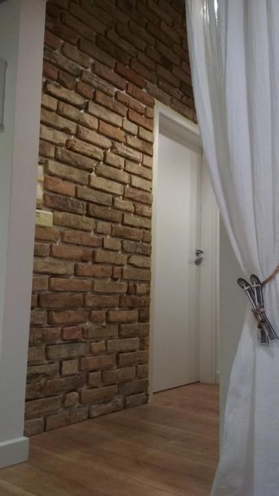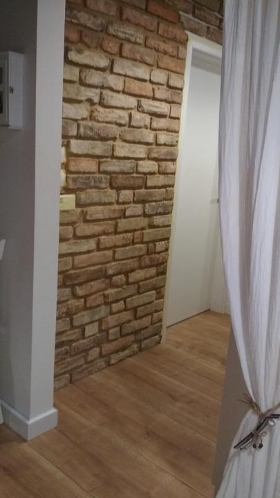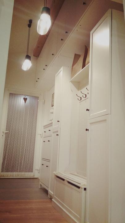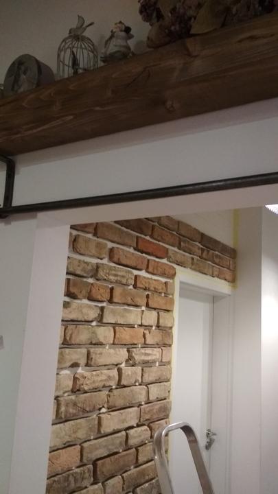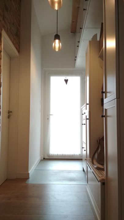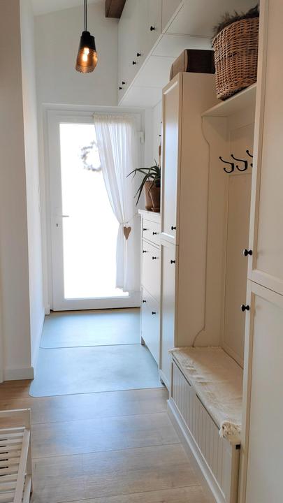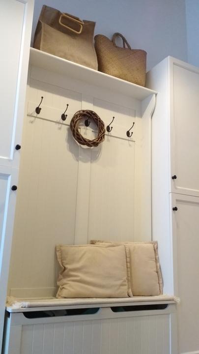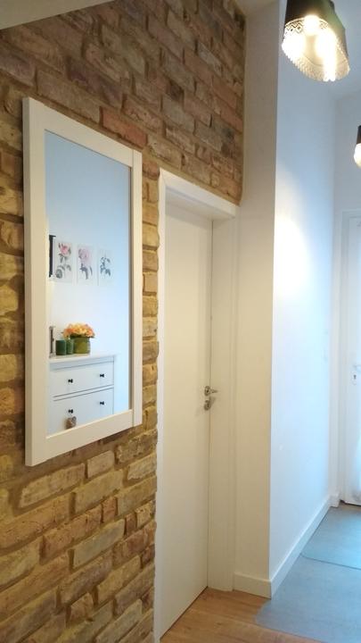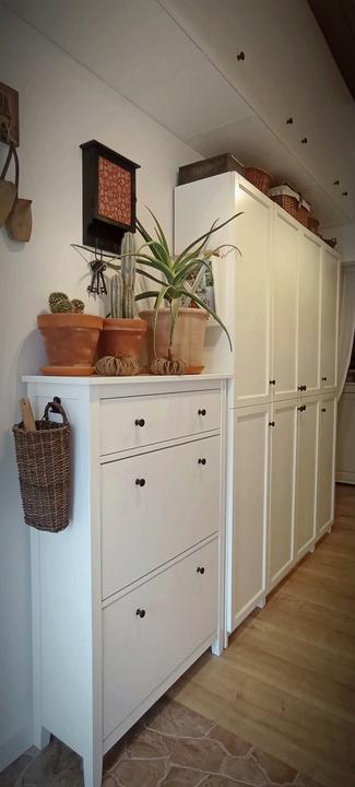 2018 Príliš biela a máme ešte krajný rez starej tehly. Sviatky a voľné dni využijeme a obložíme stenu na chodbe. Policu na topánky sme vymenili za novú skrinku na topánky, oveľa úhľadnejšie a krajšie to je, biela stále ostala, lebo je úzka ale dlhá, no som spokojná so zmenou, nad skrine vysoké dáme rad 80 cm skríň, ukladací priestor sa zíde a stropy máme vysoko 3,30 m. Škoda to nevyužiť