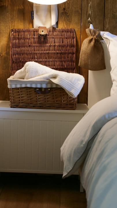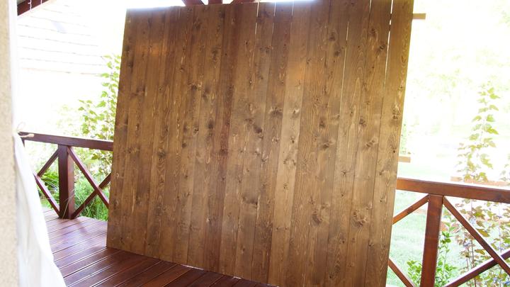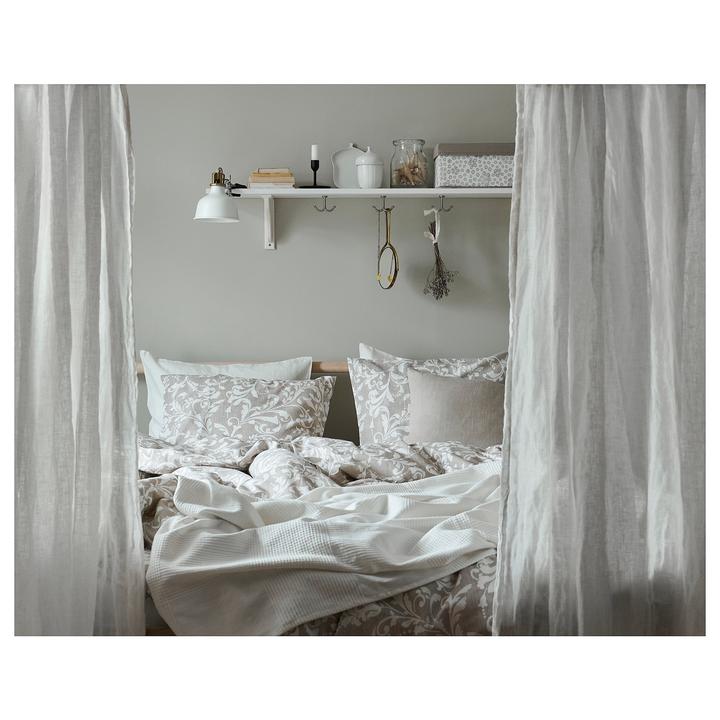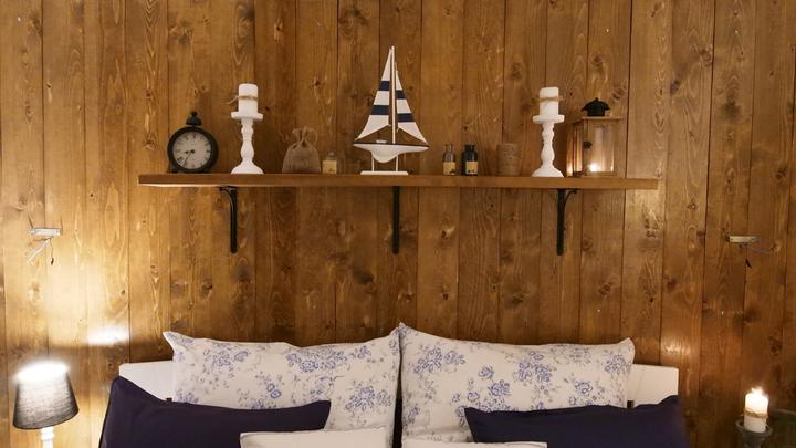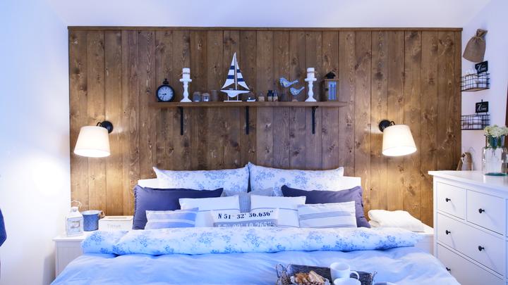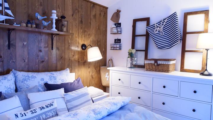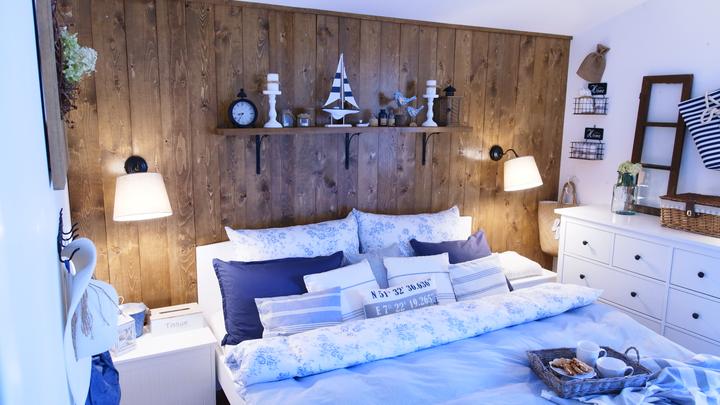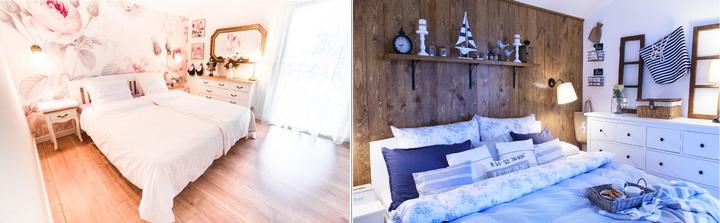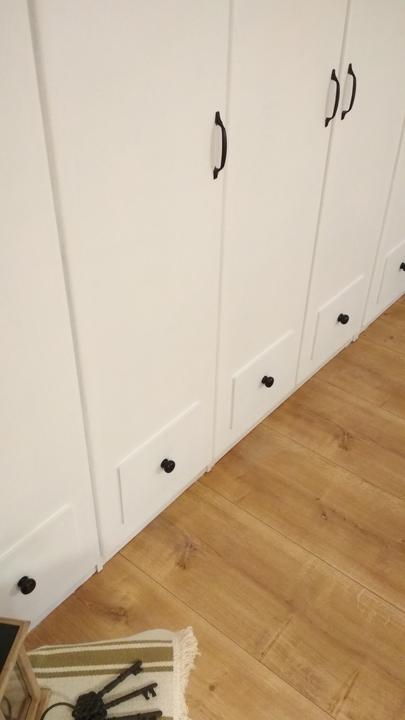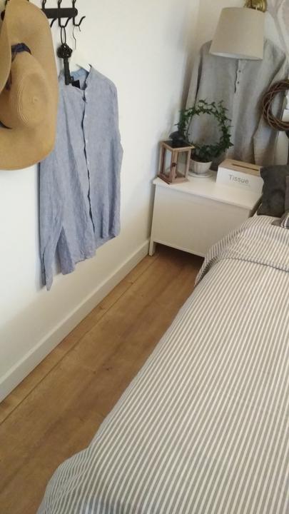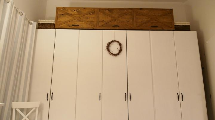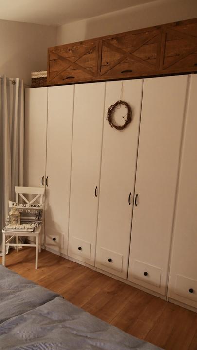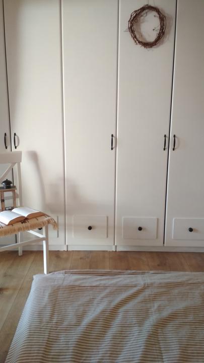 Naša spálňa je veľkostne taká klasická menšia izba s rozmermi 3,3 x 4 m. Nakoľko sme chceli využiť všetko priestor na uskladnenie šatstva, ktorý nám naša spálňa ponúkala, tak sme už na začiatku plánovania domu v dispozícii posunuli dvere čo najviac od steny, aby nám vznikol dlhý priestor na šatníkové skrine. Skrine majú výšku 1,97 m a výška stropu v spálni v najvyššom bode je 3,30 m. Na stenu za posteľou sme po nasťahovaní nalepili tapetu s veľkými kvetmi pivonii. Komoda sa mi vždy žiadala mať v spálni, najskôr bola s tvarovanými nožičkami aj vrátane nočných stolíkov ale asi po pol roku som si uvedomila, že to nie je to, čo som si asi predstavovala a tak sme komodu aj nočné stolíky predali a kúpili sme overenú jednoduchú ikea komodu hemness a nočné stolíky sme tiež vymenili za iné. Tapeta tapeta tapeta, veľmi výrazný prvok, farebne. Nejak to ale nebolo to, čo som chcela a tak som doma zahlásila, nedáme na stenu za posteľ drevo? Samozrejme, nebolo to odsúhlasené okamžite, no prešiel asi pol rok, možno rok a prišiel deň D a začali sme pracovať na obložení steny v spálni. Drevo pekne za ten čas vyschlo, na rozmer sme ho napílili, ohoblovali, vykartáčovali, aby bolo príjemné na dotyk aj na pohľad. Následne sme ho impregnovali impregnáciou proti škodcom. Na drevo sme použili xyladecor odtieň dub v dvoch alebo v troch náteroch, vždy po dôkladnom vyschnutí a prebrúsení jemným brúsnym papierom. Následne som drevo natrela hodvábne jemným lakom a mohli sme sa pustiť do montáže. Drevo bola výborná voľba, spálňa pôsobí teplejšie, útulnejšie a môžem sa realizovať s dekoráciami, či už podľa ročného obdobia alebo pocitov alebo len tak, pre zmenu :D