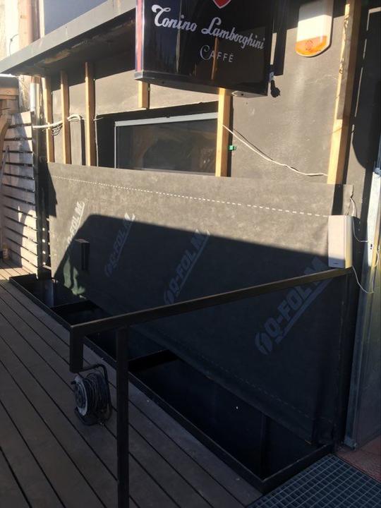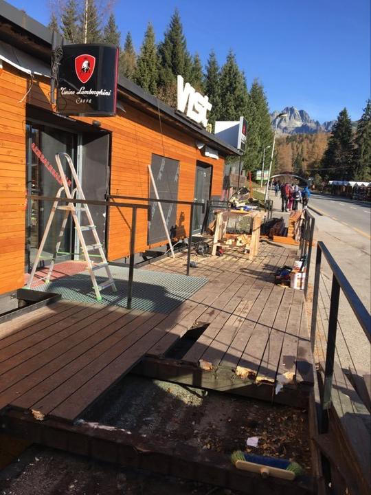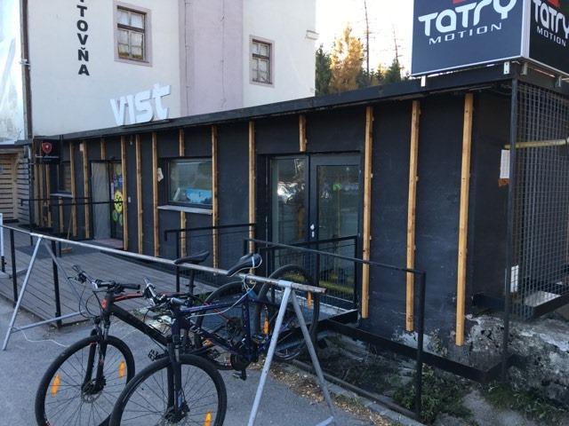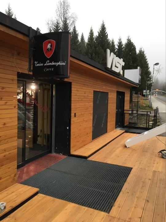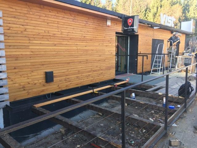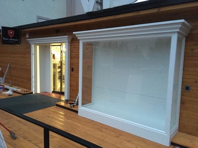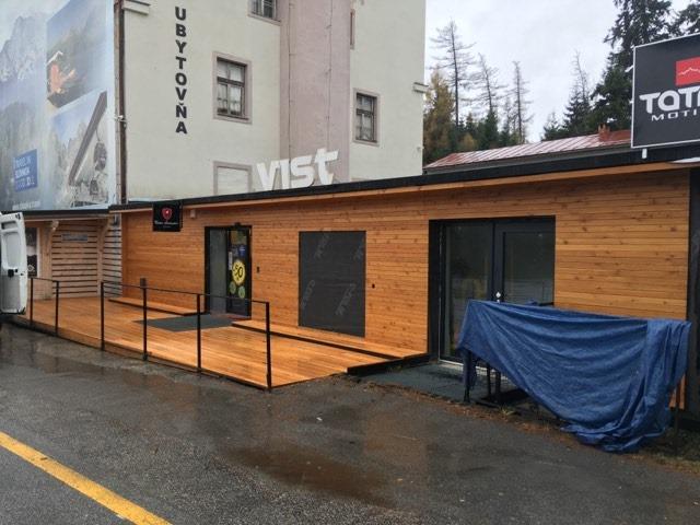 Obklad fasády - sibirský smrekovec Dlážkovica - sibirský smrekovec Vstupná šambrána a výkladna skriňa -povrchová úprava olej a rall9010