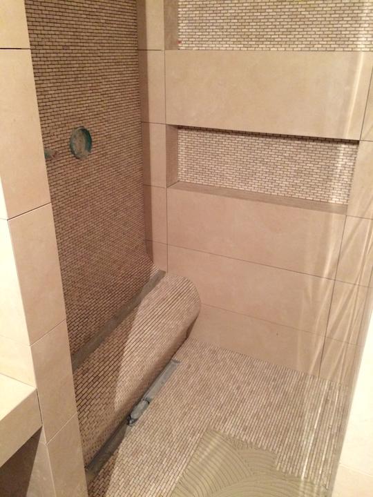 Travertínové mozaiky sa ideálne hodia na oživenie travertínovej kúpeľne, kde sú použité väčšie formáty. Toto je presne jeden z projektov, kde je travertínová mozaika použitá vhodne a celú kúpeľňu rozjasní.
