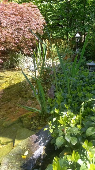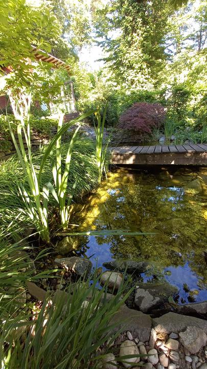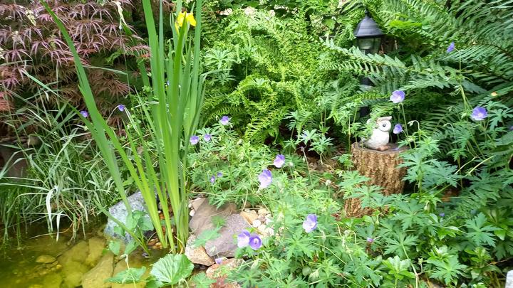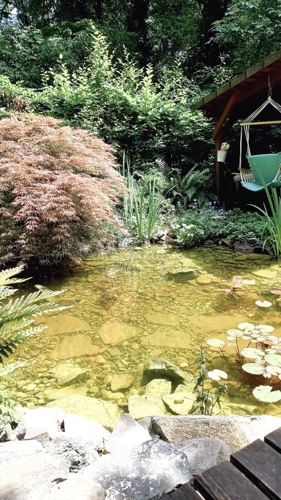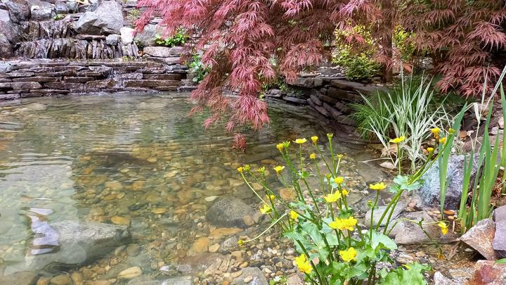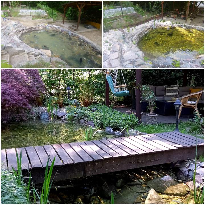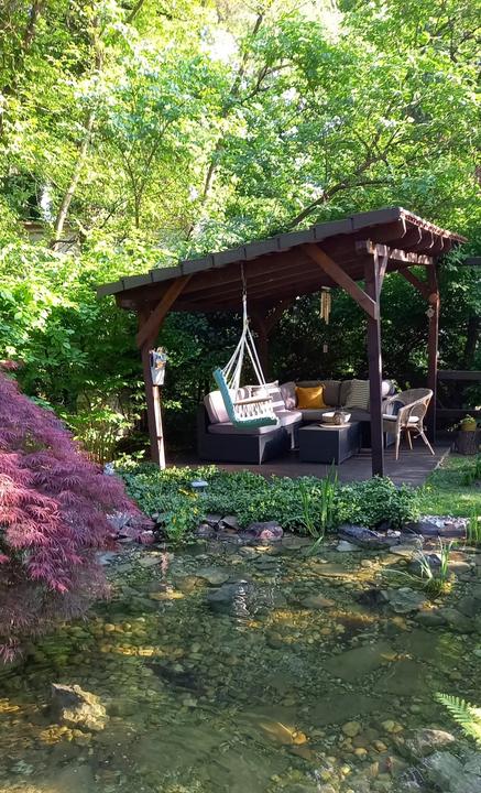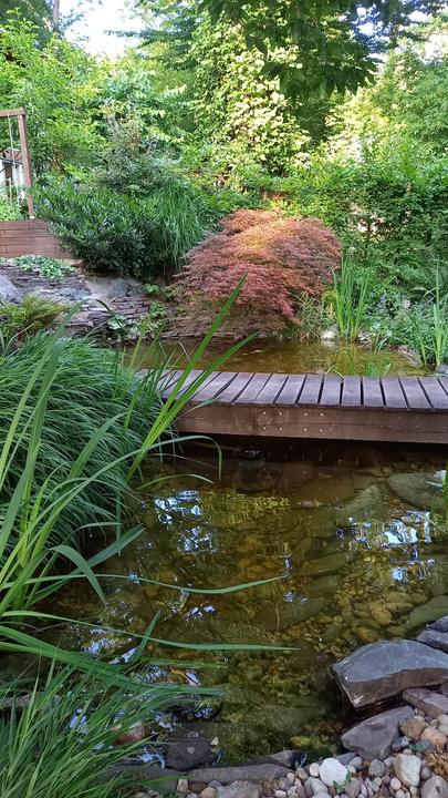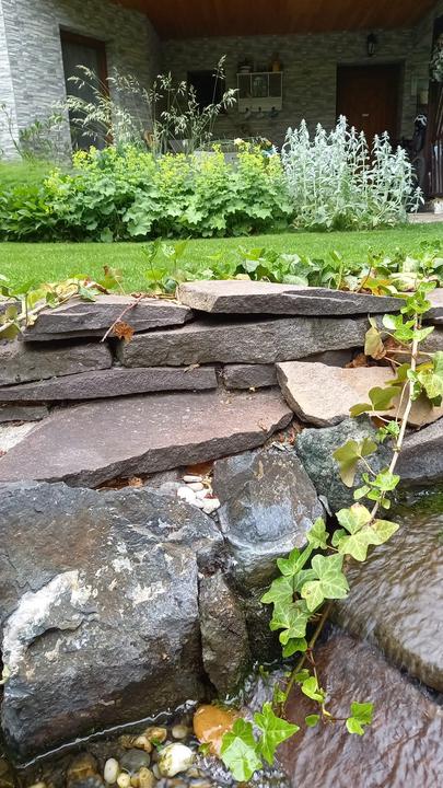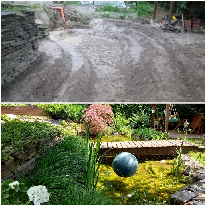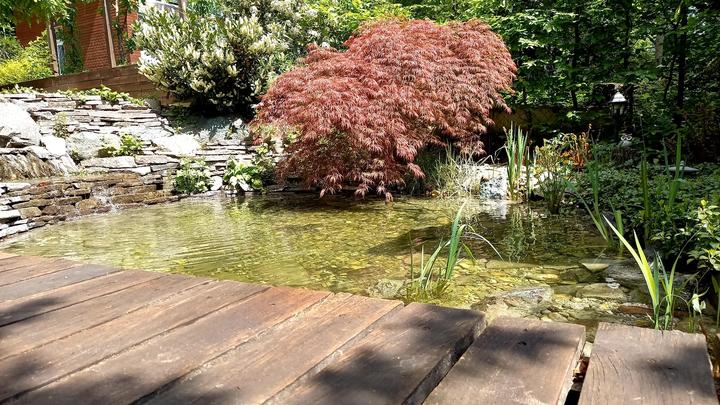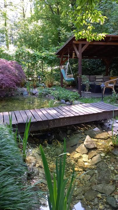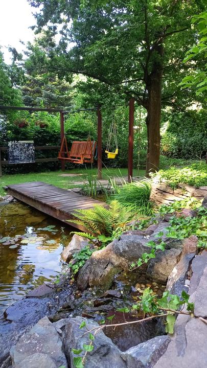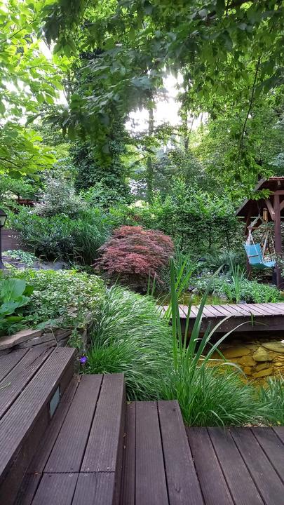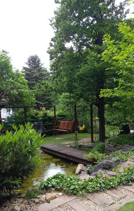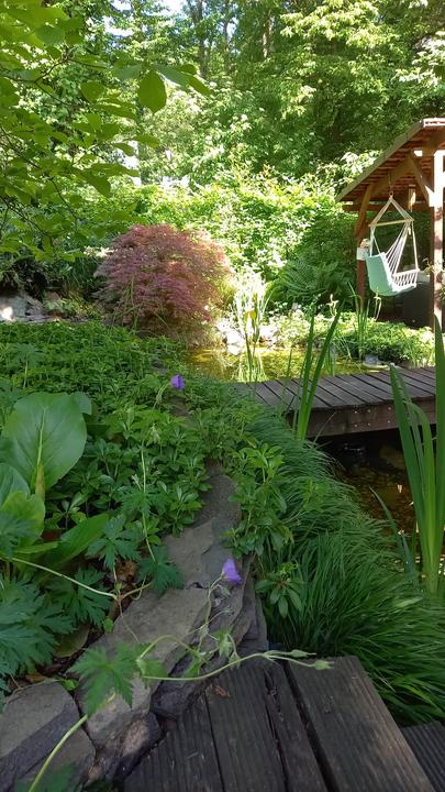 Polotienistá záhradka v zmiešanom lese v svahovom teréne s jazierkom.