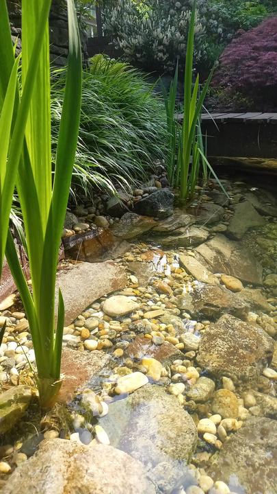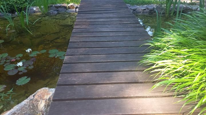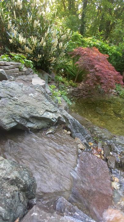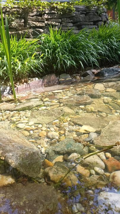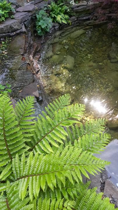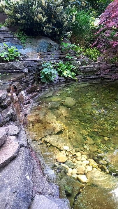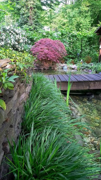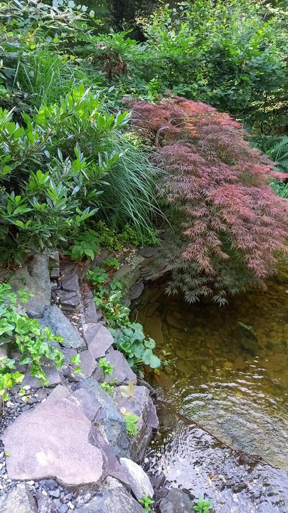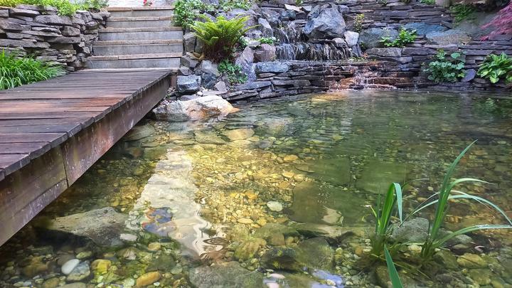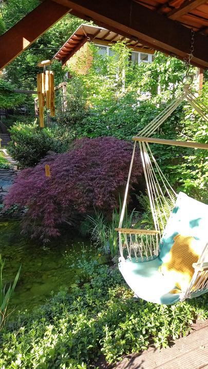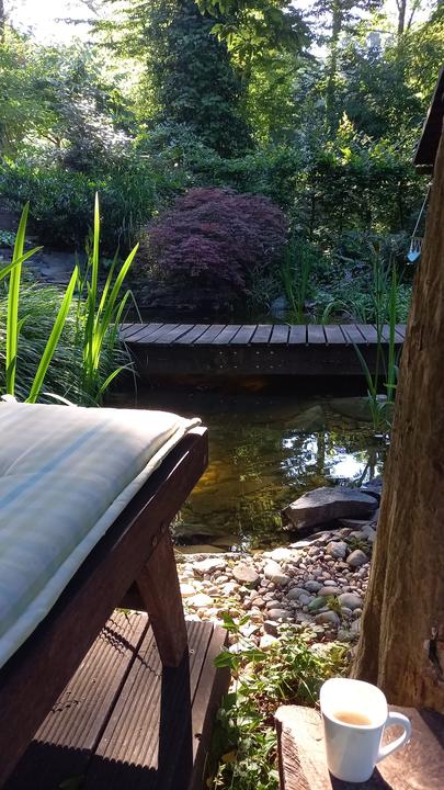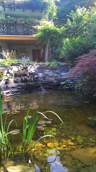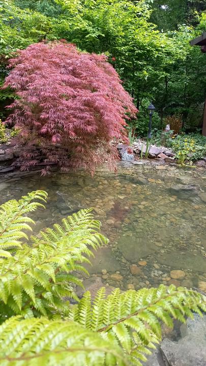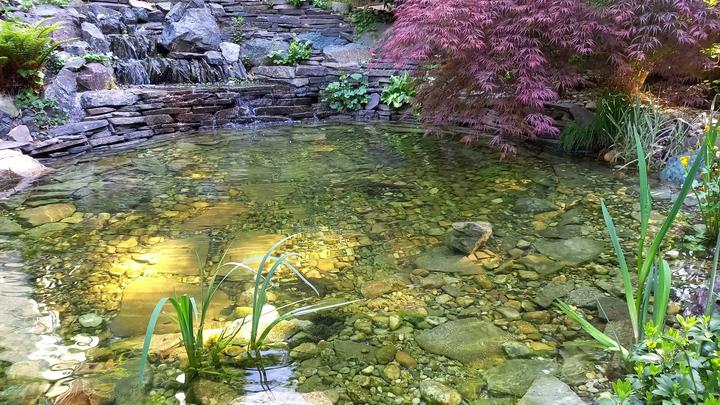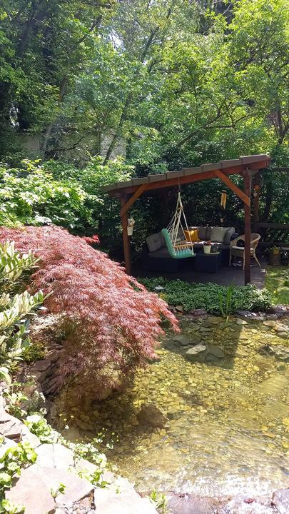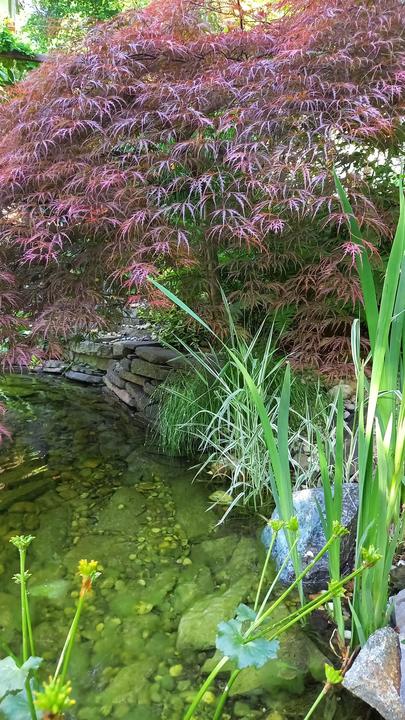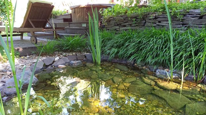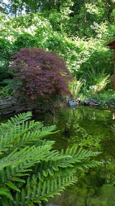 Polotienistá záhradka v zmiešanom lese v svahovom teréne s jazierkom.