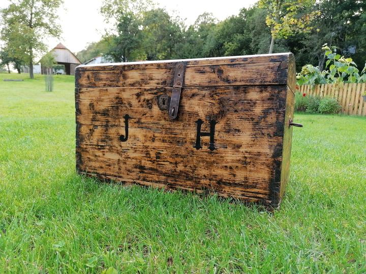 Táto truhlica skončila oficiálne svoju cestovateľskú púť v roku 1914. Boli to jej posledné majjére v "Lensdorfe". Odvtedy stála na povale a spoločnosť jej robili červotoče. Prázdnotou síce nezívala, ale aj tak som pre ňu našla nové využitie. Keď som ju vyniesla na svetlo sveta, objavila som na nej iniciály. Chcela som ich zachrániť, jedna sa mi aj podarila, ale na druhý deň som prišla k truhle, vzala brúsku a reku, čo je to tu za čiernu čmuhu...a bolo aj po druhej iniciálke. Našťastie som ich nafotila a všetko je tak ako má byť.