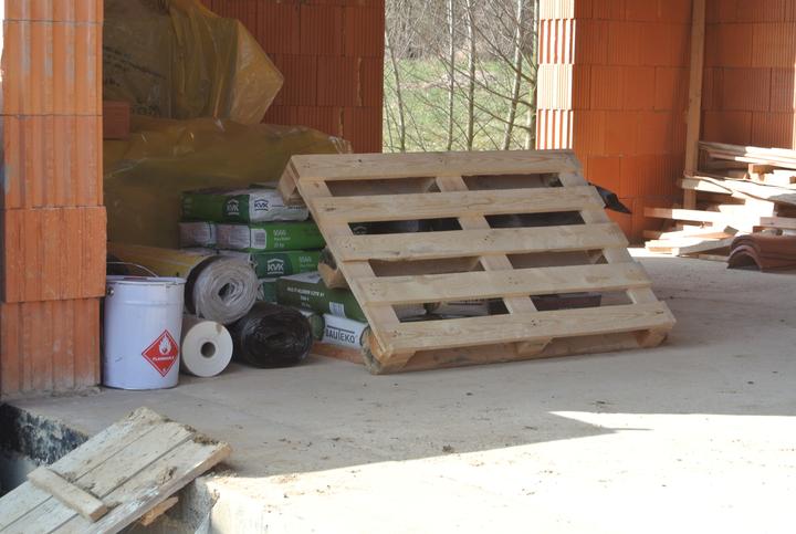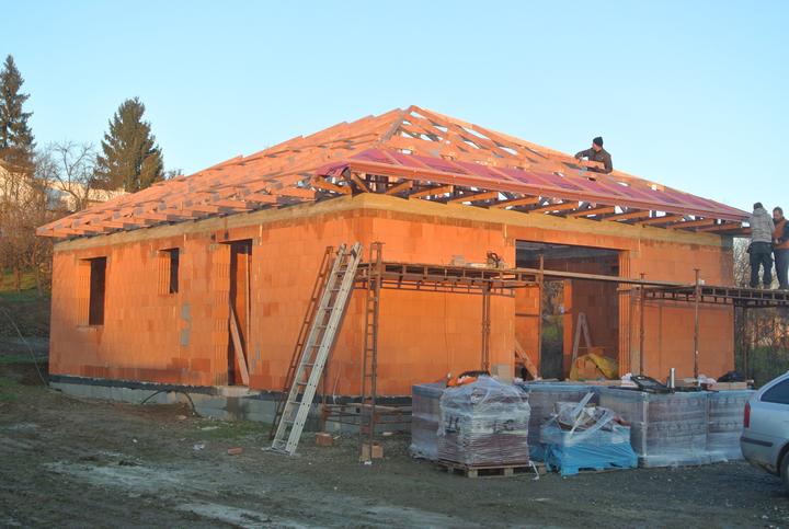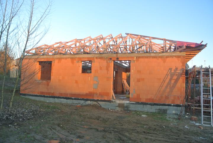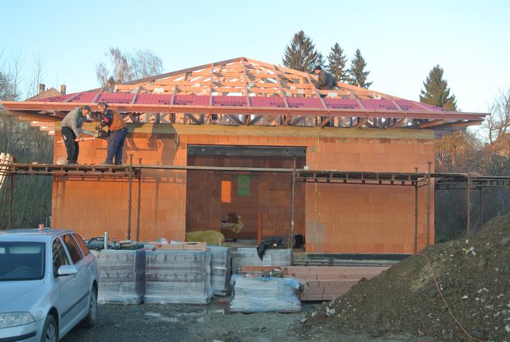 23.11.2017 - doviezli nám väzníky Polystav Rožňava, začíname so strechou, krytina tehlovočervená KM Beta Briliant..