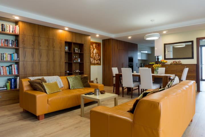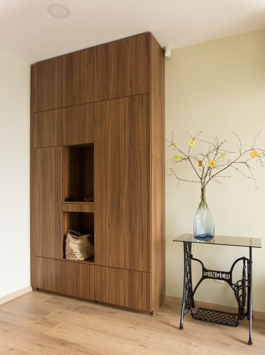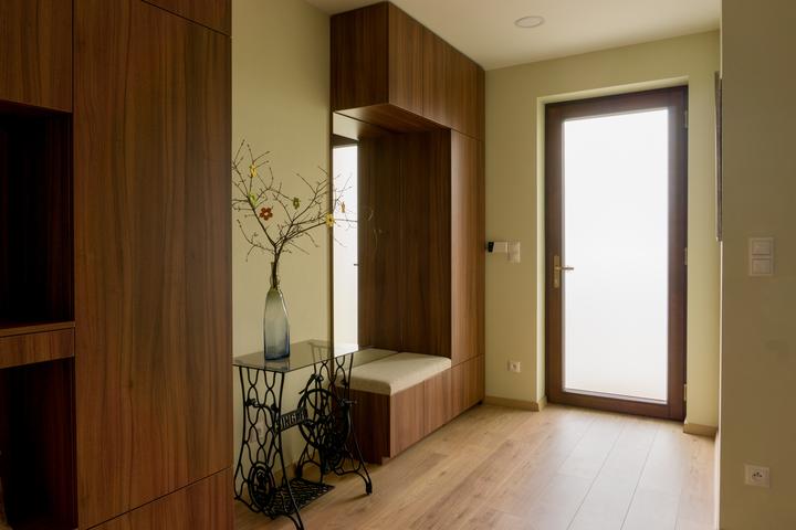Obytnú časť domu ovplyvnila do veľkej miery požiadavka klientov na množstvo úložného priestoru. Na mieru navrhnutá obývacia stena sa tiahne pozdĺž takmer celej miestnosti a opticky nadväzuje na kuchynskú zostavu. Interiéru dominuje z materiálového h…