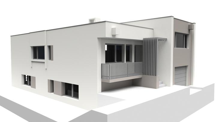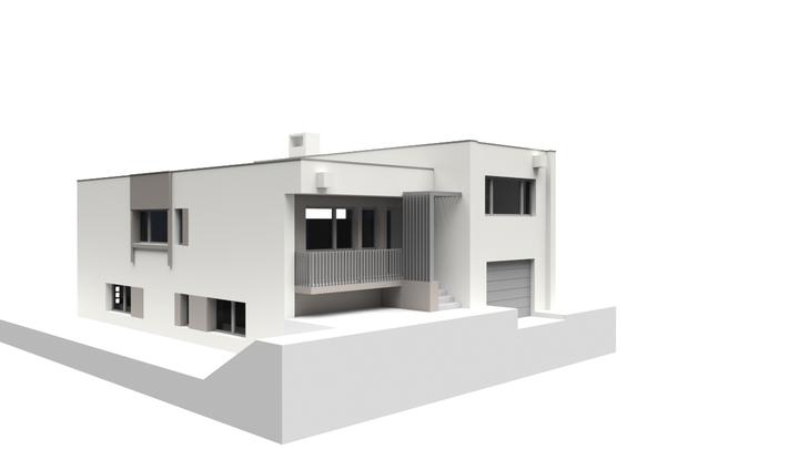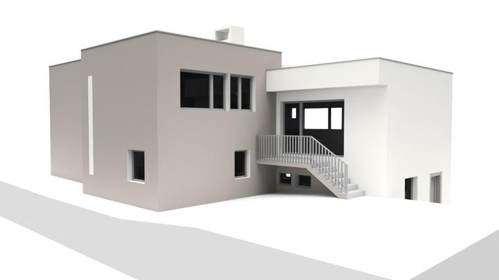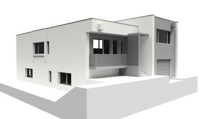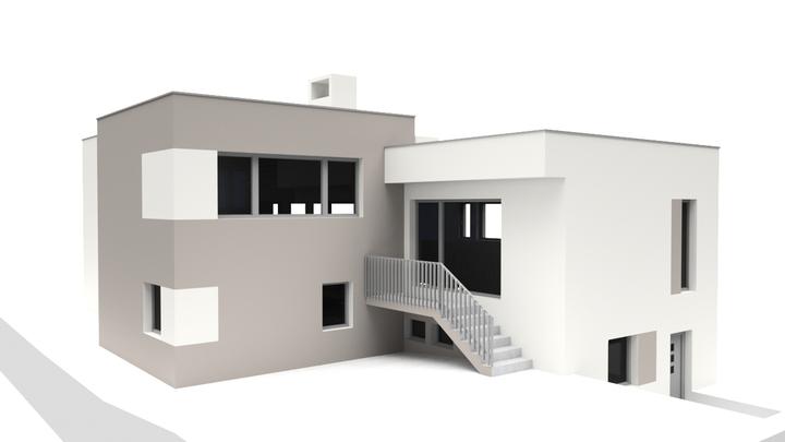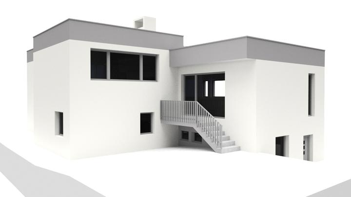 Návrh fasády rodinného domu s návrhom prekrytia schodiska. Požiadavka bola na použitie len bielej a jemne šedej farby.