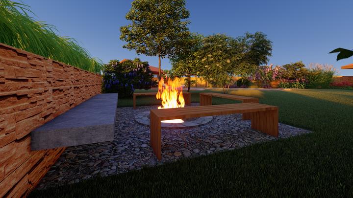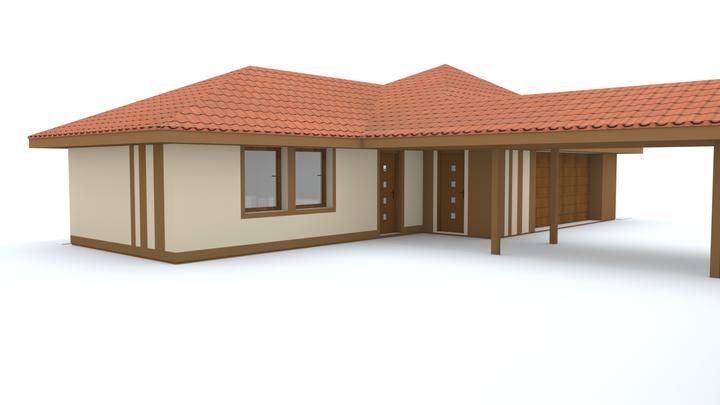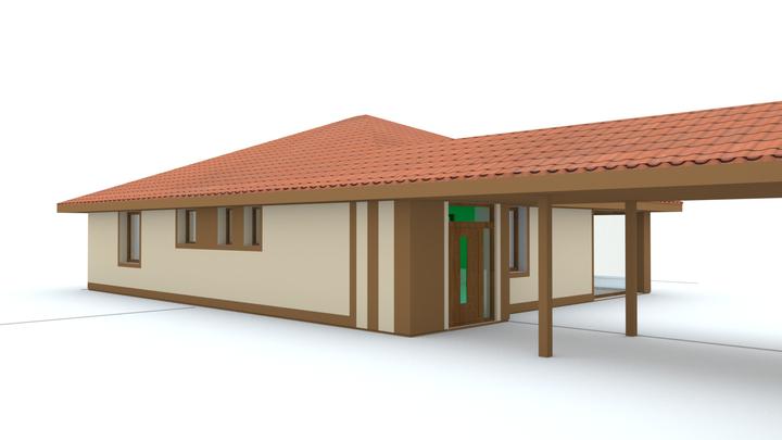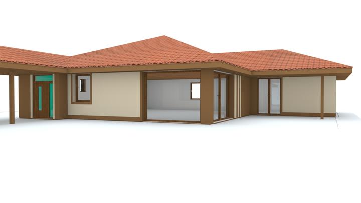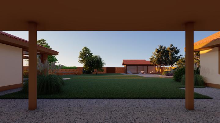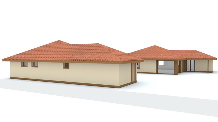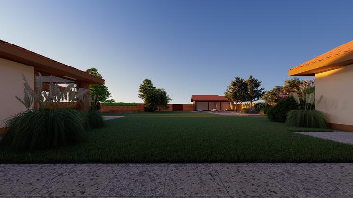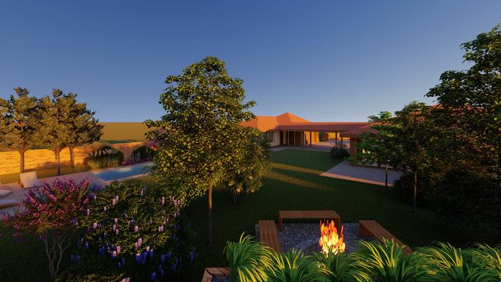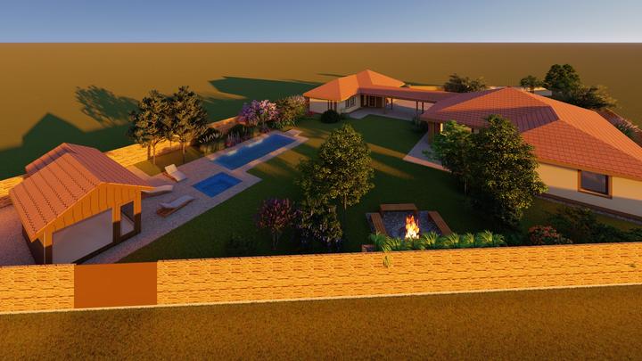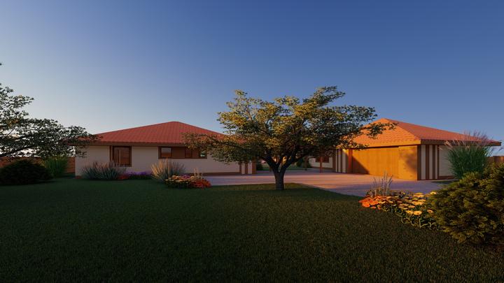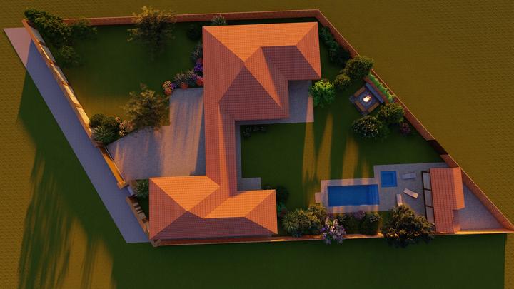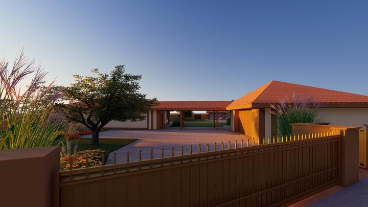 Návrh fasády rodinného domu, oplotenia a predbežné rozmiestnenie prvkov záhrade