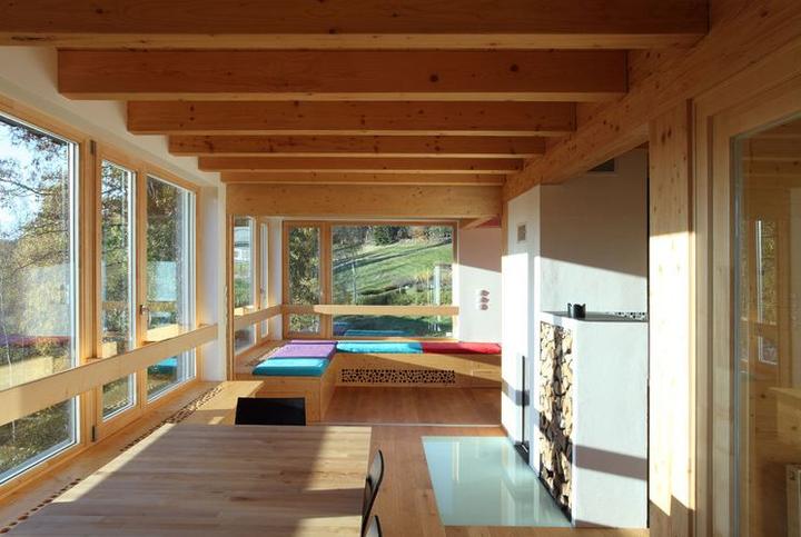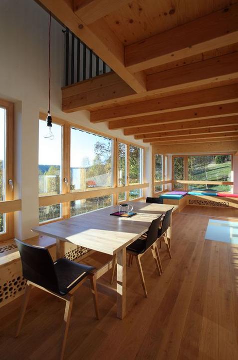 Drevený dom, drevené podlahy, lavica i stoličky... Stoličky Stockholm: http://www.stolickyton.sk/stolicka-stockholm-311700/ Viac info tu: http://www.archiweb.cz/buildings.php?action=show&id=4189&type=19