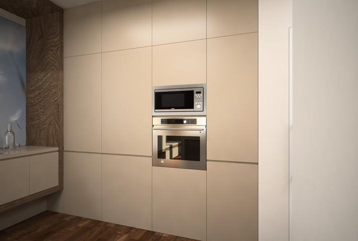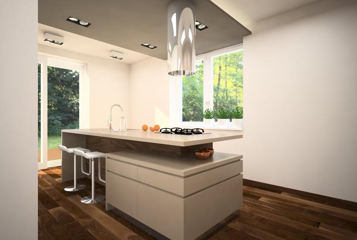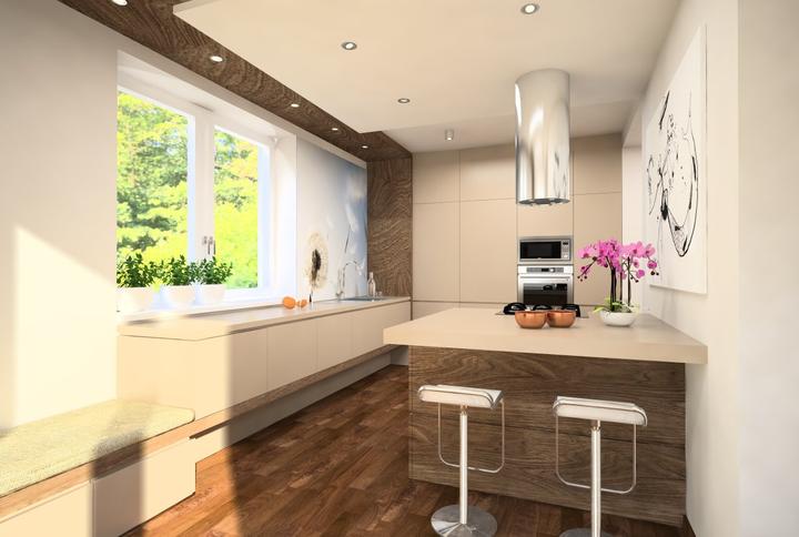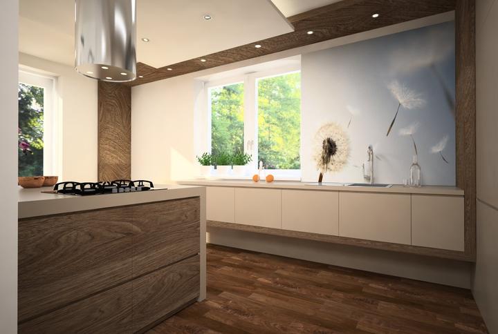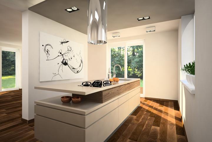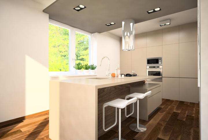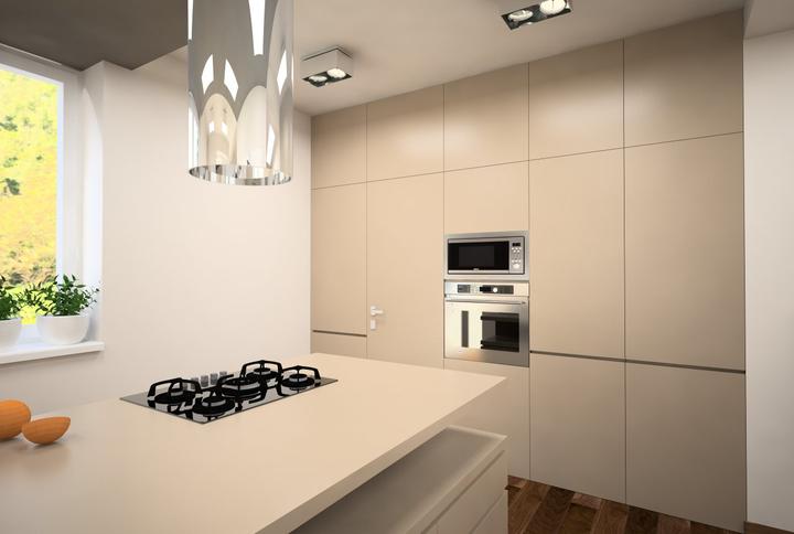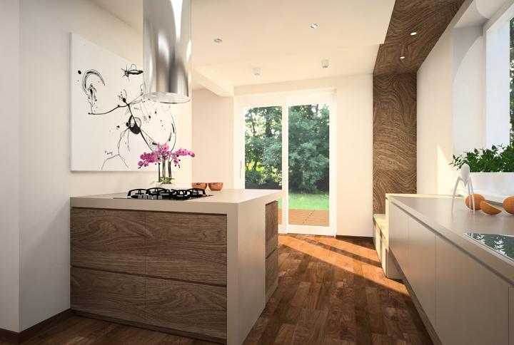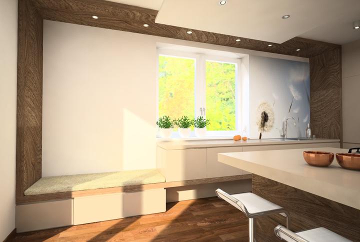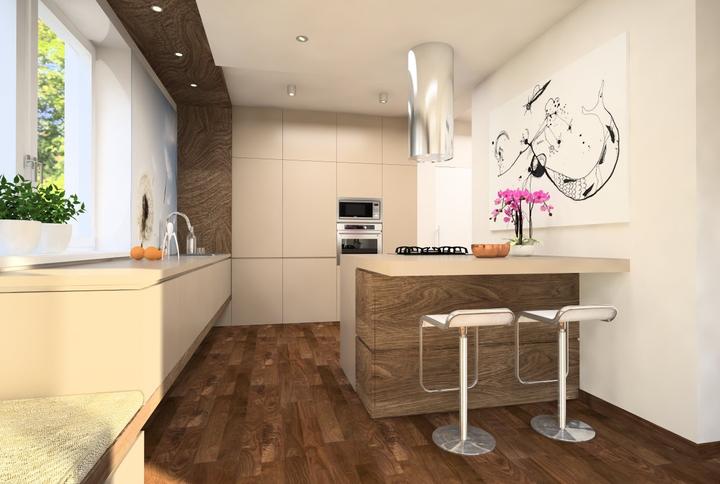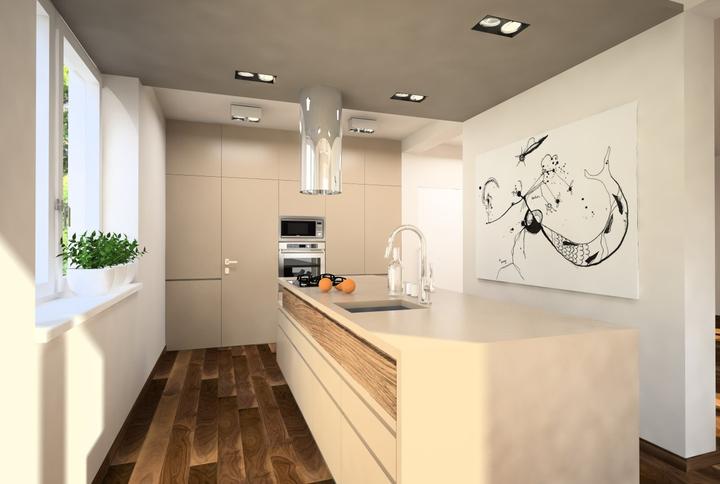 Nosným prvkom návrhu kuchyne bola požiadavka zakomponovať do dispozície ostrov s varným centrom a barovým sedením. Ostrov nakoniec prilieha k stene. Pod oknom ho dopĺňa horizontálny pult so sedením, umiestneným v drevenom leme. Nábytková stena so vs…