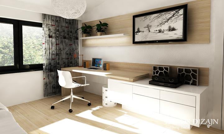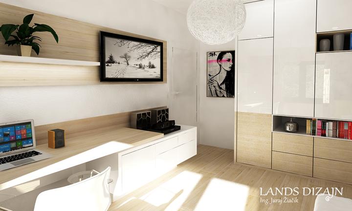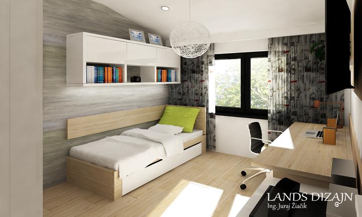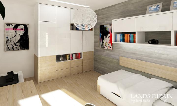 Návrh modernej študentskej izby s príjemnými odtieňmi svetlohnedého dubu a bielej farby. Priestor dopĺňa sivá tapeta a záves so štýlovým vzorom.