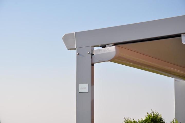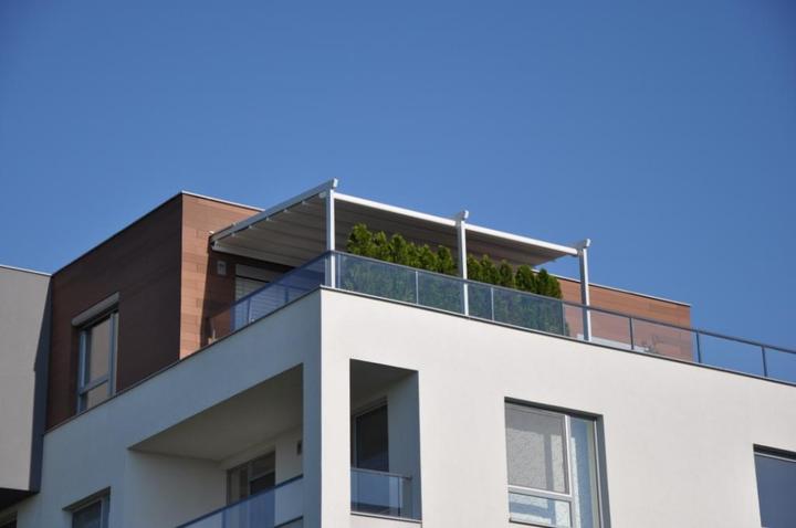 Pergolová clona "Pergotenda Iridium" - zatienenie terasy strešného bytu.