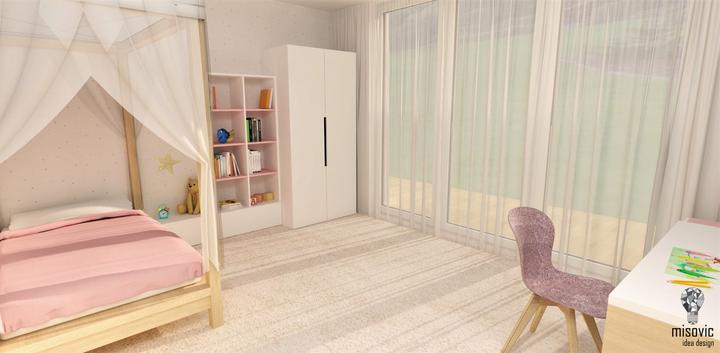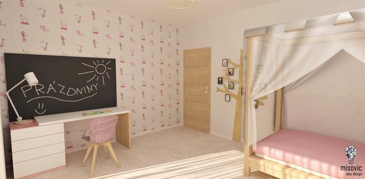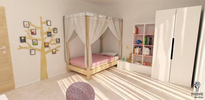 Návrh interiéru detskej izby pre dievča v školskom veku. Dominantná tu je masívna dubová posteľ s baldachýnom. Nad písacím stolom vyniká tabuľa na kreatívne zaznamenávanie zážitkov a udalostí. Na výstavu spomienok slúži strom s fotkami.