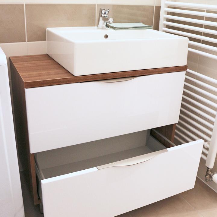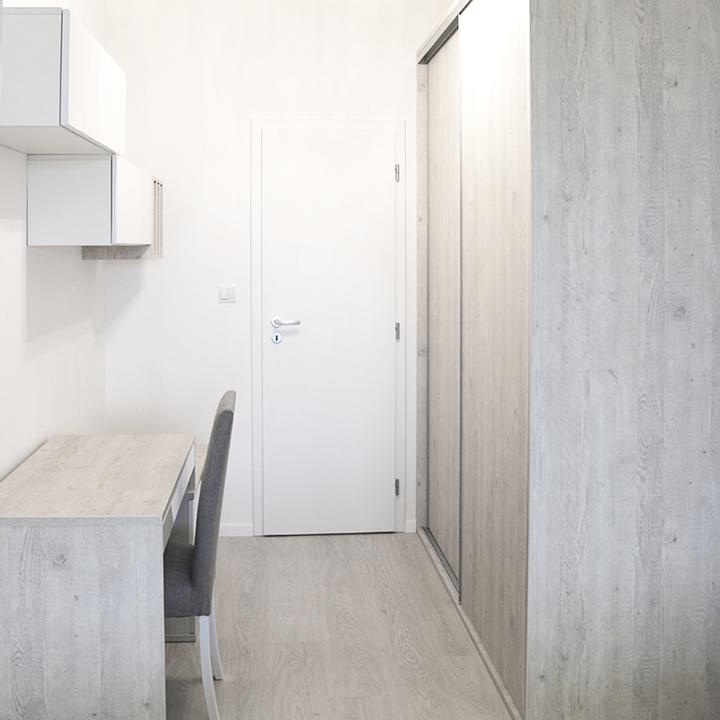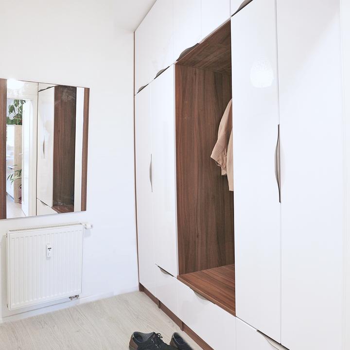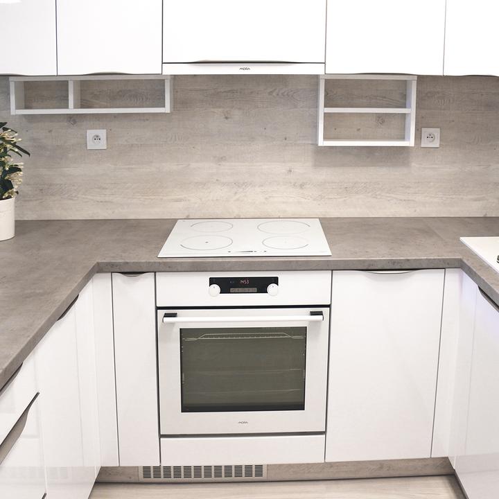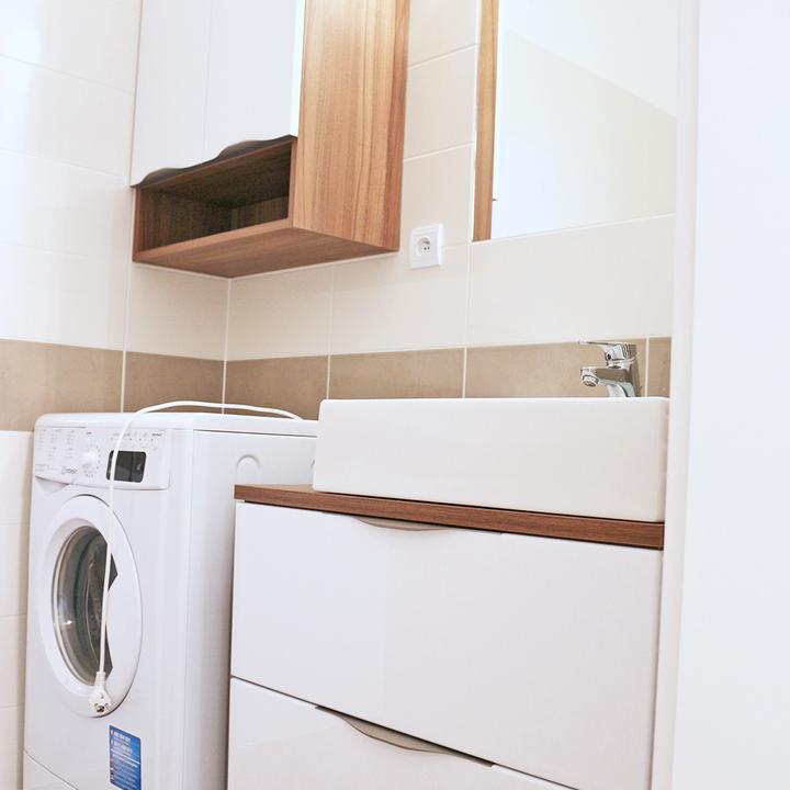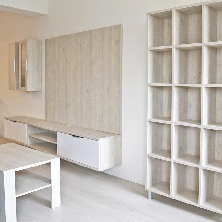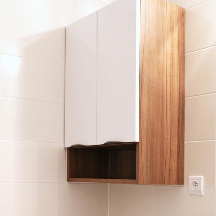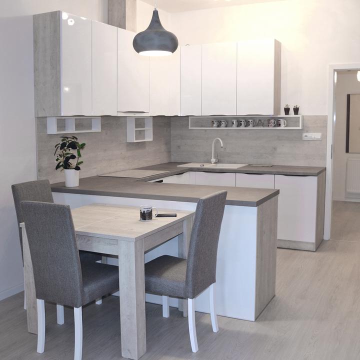 Jednoduché a čisté línie interiéru podčiarkuje prevažne biela lesklá farba, doplnená jemným drevodekorom borovice. Kuchynský a jedálenský priestor je zaujímavo oddelený od obývačkovej časti veľkým akváriom. Obývačku rozžiarila tyrkysová sedačka. V spálni je odkladací priestor s podsvetením nad posteľou, šatníková skriňa a toaletka s poličkou na platne. V predsieni a kúpelni je použitý výraznejší drevodekor a dvierka rovnako biele lesklé.