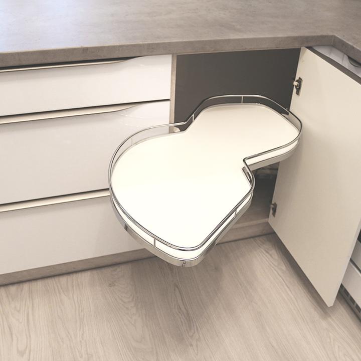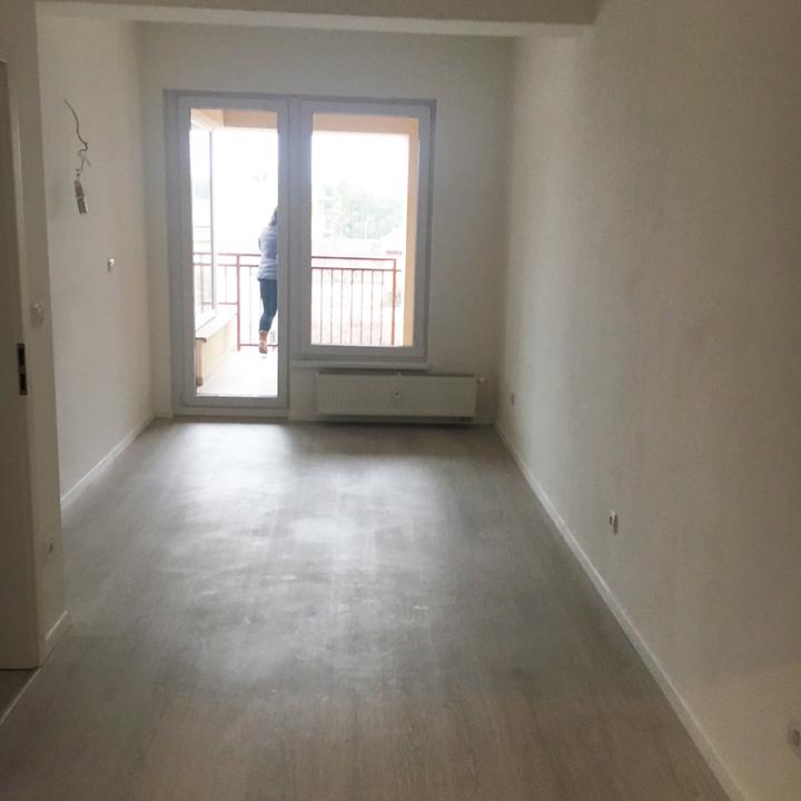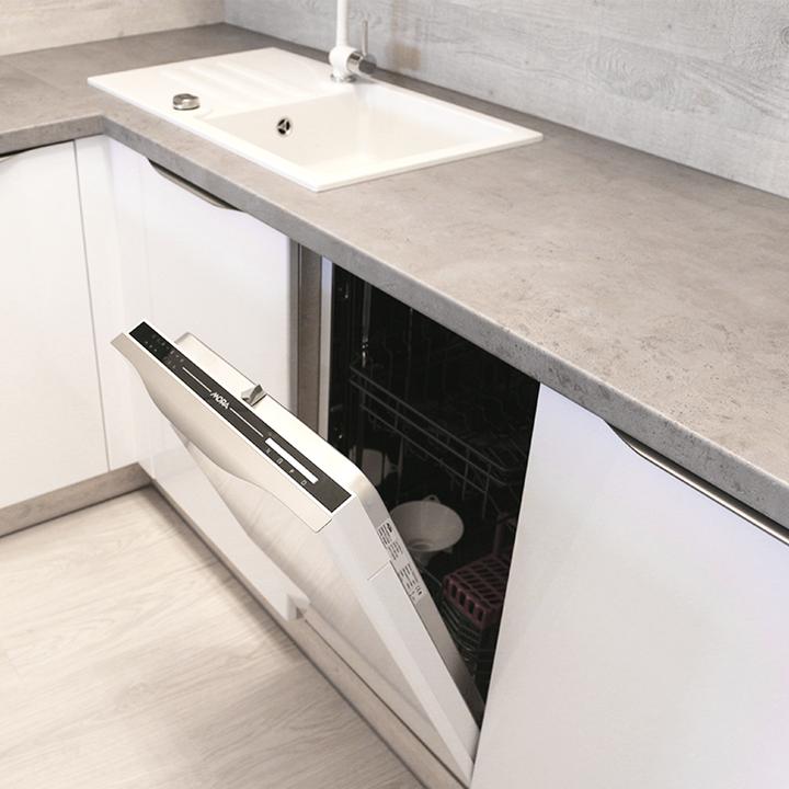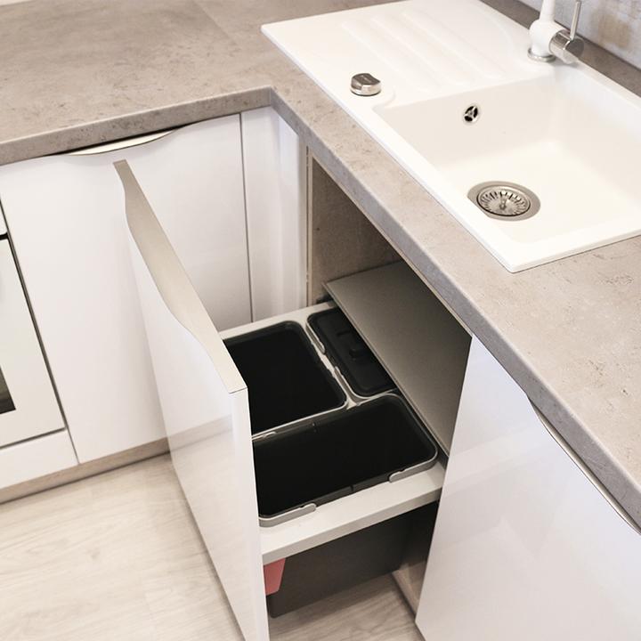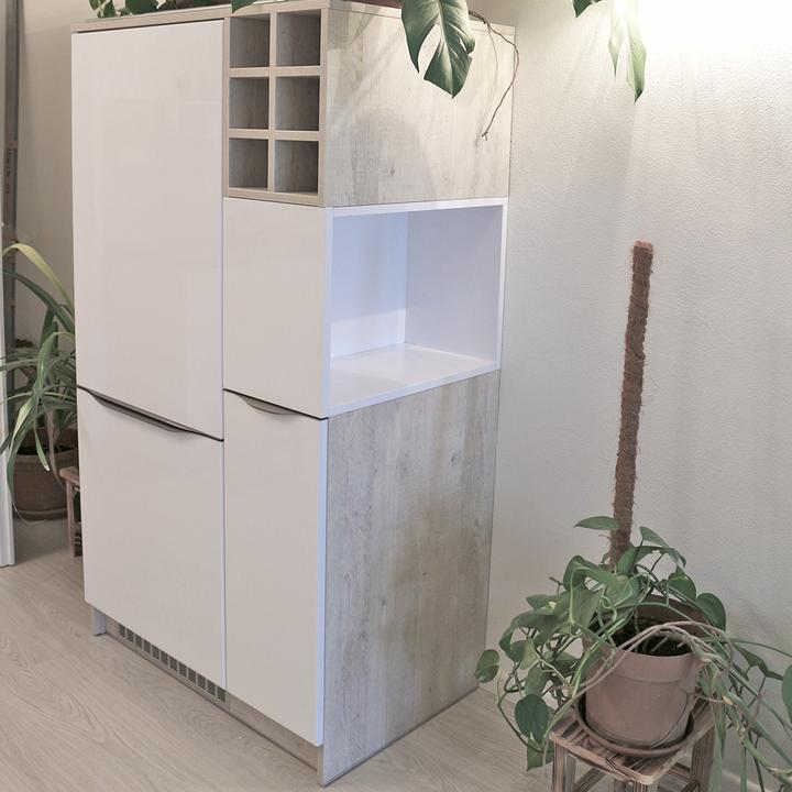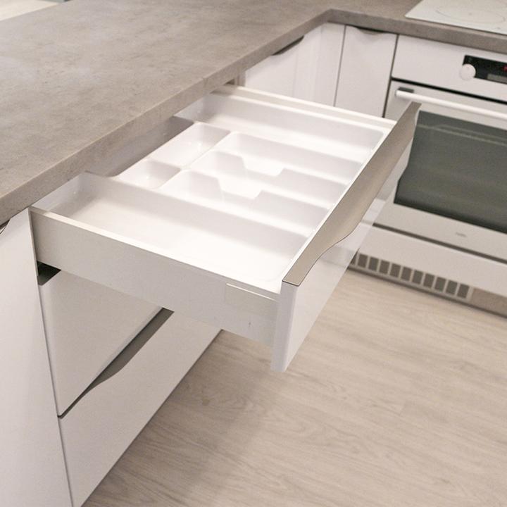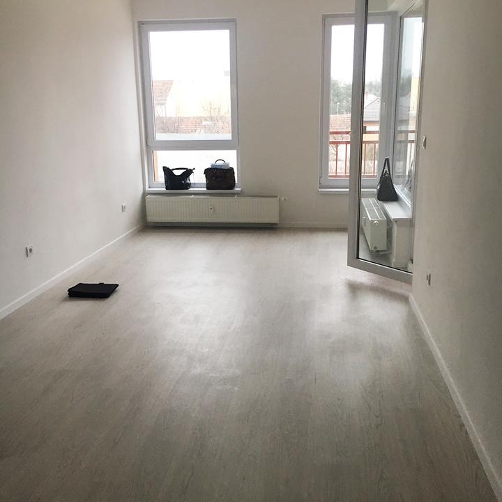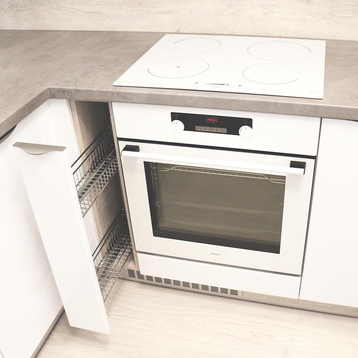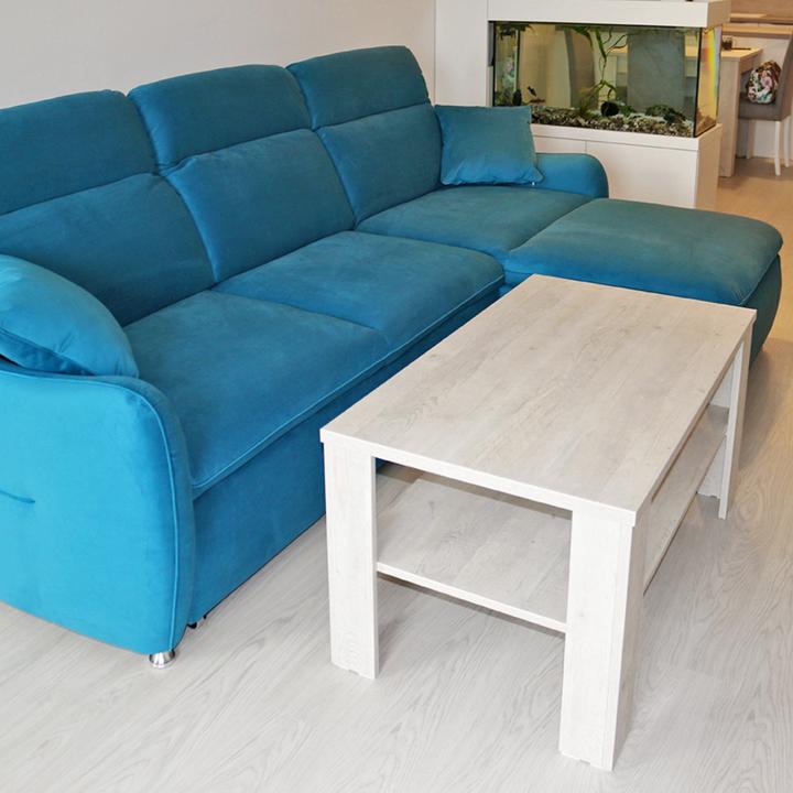 Jednoduché a čisté línie interiéru podčiarkuje prevažne biela lesklá farba, doplnená jemným drevodekorom borovice. Kuchynský a jedálenský priestor je zaujímavo oddelený od obývačkovej časti veľkým akváriom. Obývačku rozžiarila tyrkysová sedačka. V spálni je odkladací priestor s podsvetením nad posteľou, šatníková skriňa a toaletka s poličkou na platne. V predsieni a kúpelni je použitý výraznejší drevodekor a dvierka rovnako biele lesklé.