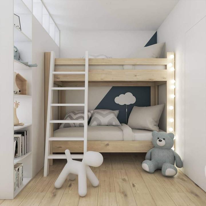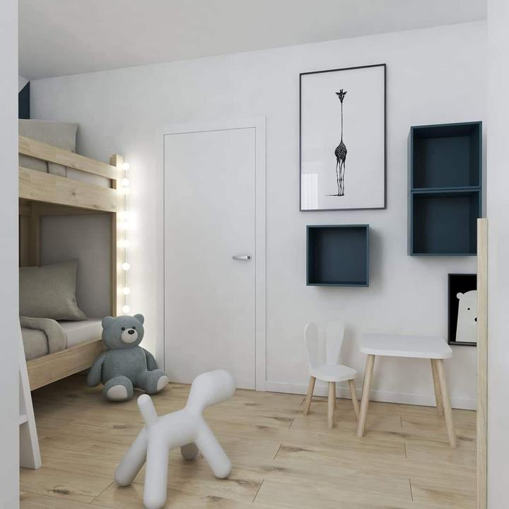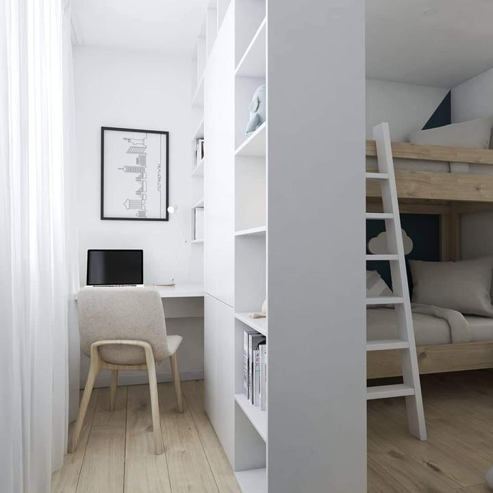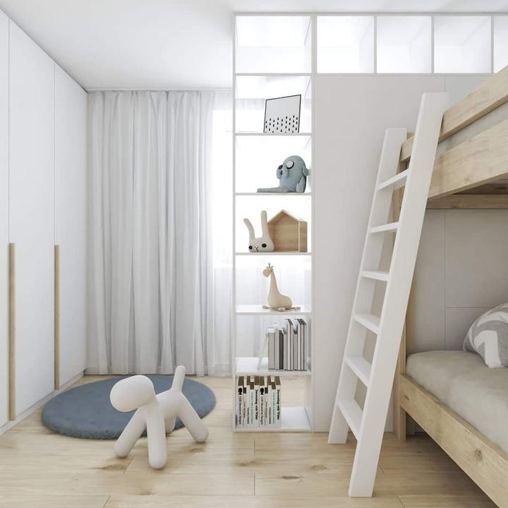 Pohľad do detskej izby, kde hlavnou požiadavkou majiteľky bytu bolo vytvoriť pracovnú časť pre staršieho syna "akési sukromie", keďže túto izbu zdieľa s mladším bratom.