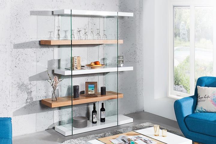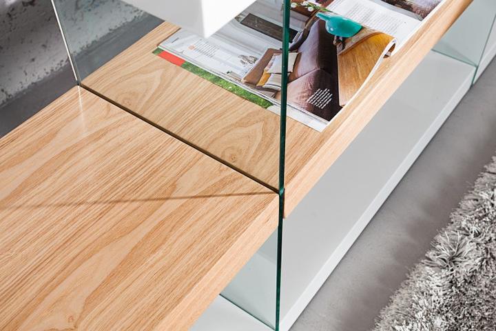 Dizajnový policový regál zo série ONYX v kombinácii bielej vysoký lesk a pravej dubovej dyhy. Tento vysoký regál až 180cm je zaujímavý svojim prevedením a kombináciou so sklom. Prevedenie políc, ktorá je hrubá takmer 4cm, sa striedajú biela a dreven…