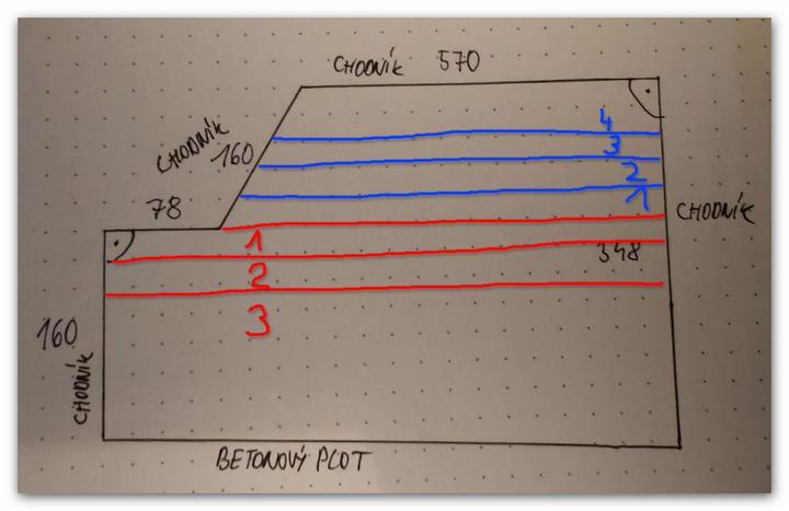 Potom keď sa dostanem k plotu tak na druhom konci začnem postupne robiť rady smerom k šikmej ploche a budem postupovať smerom k chodniku domu (modra šípka). Je to za Vás ok?