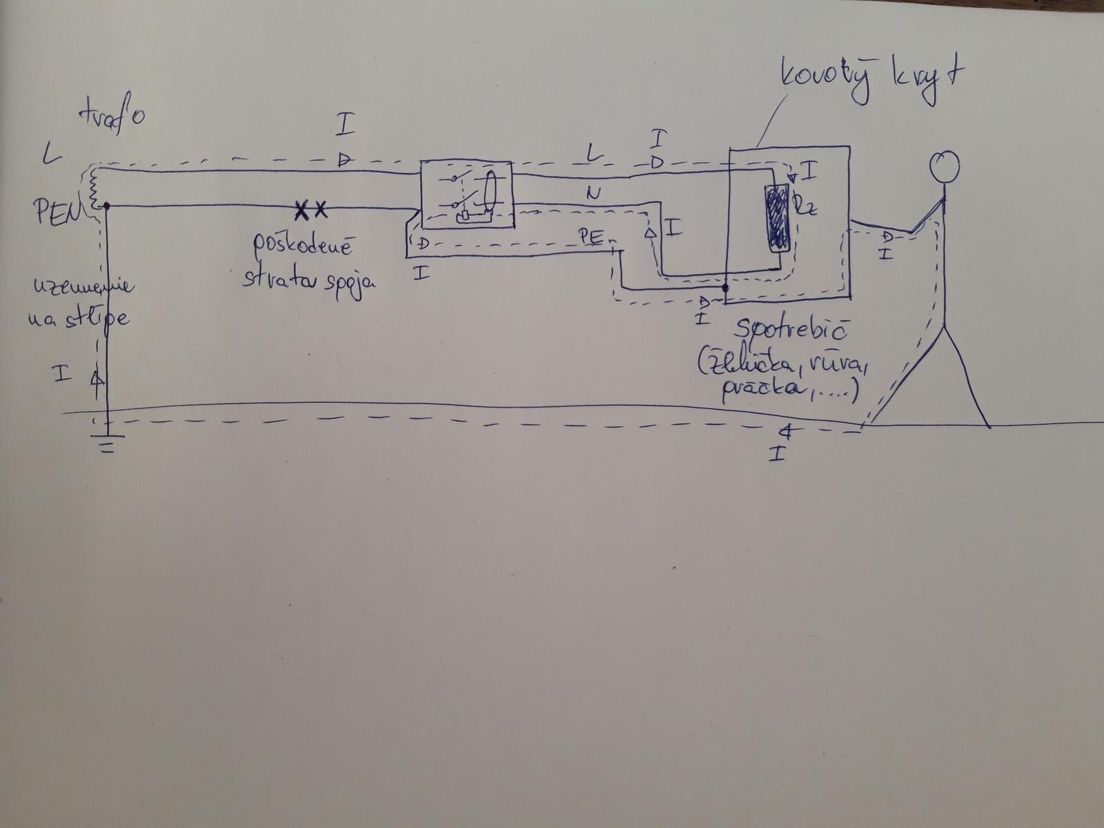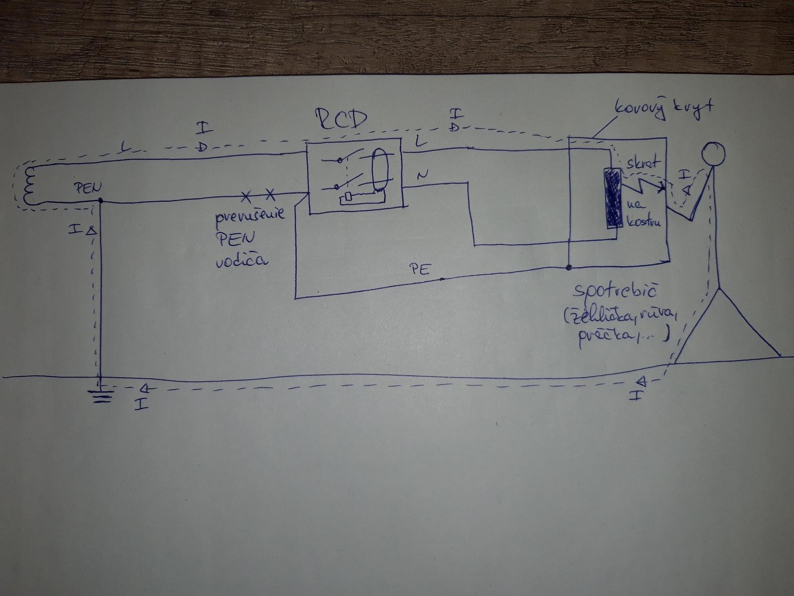 @merak Tak podľa obrázku: Čiže ak vypadne PEN vodič ,potom prúd z L vodiča sa dostane na PE a N vodiče až do chrániča a na to by mal ten chránič zareagovať ,mal by vedieť že mu chýba N vodič ,že sa niečo zmenilo a mal by vypnúť obvod. Ak nie ,potom je to blbý chránič,slabo chráni.