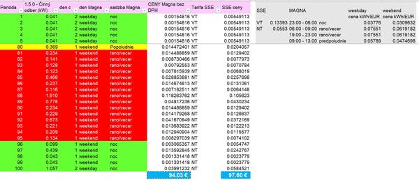 a teraz k cene, všimni si že Magna uviedla cenu silovej energie v MWh za rôzne časové obdobia a SSE celkovú v kWh ale nt a VT iné časy, porovnaj kedy koľko spotrebuješ,pozri si ich konkrétne stránky a rozdiel je podstatný
