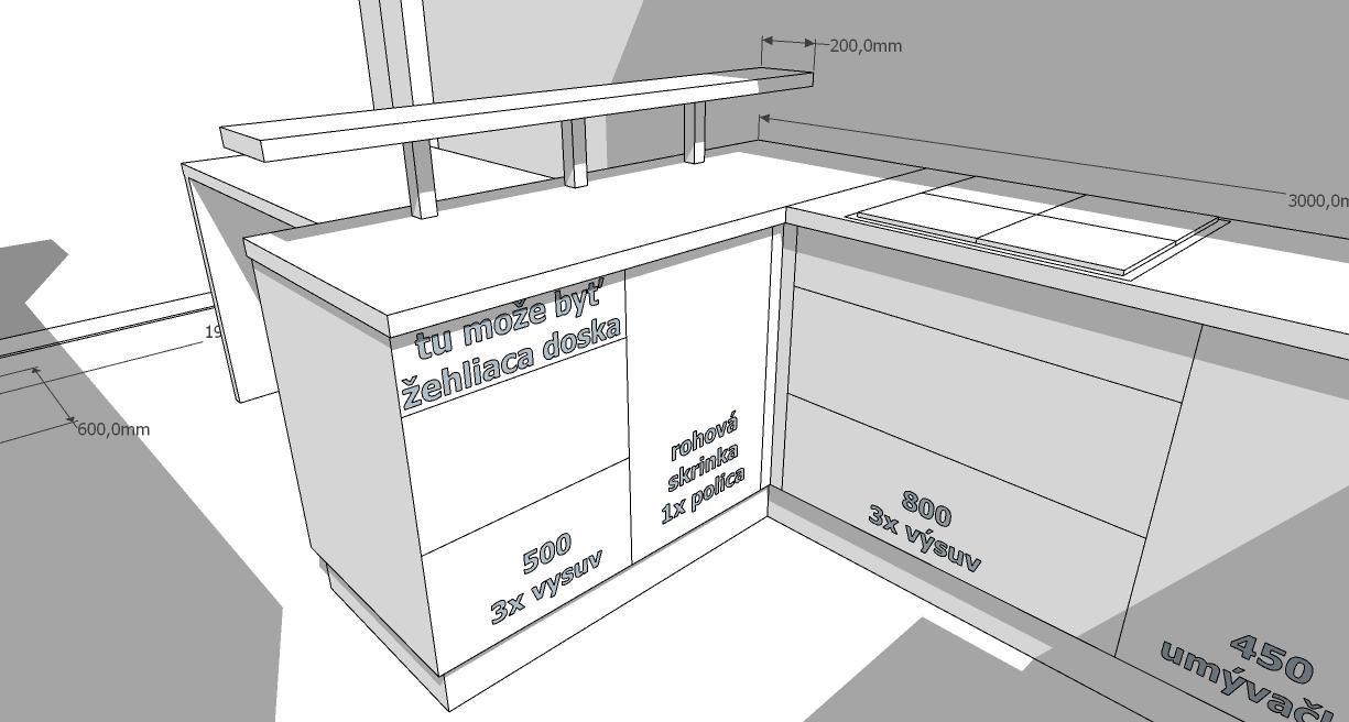 + Zafrezovane uchyty vraj a ešte tam mám 11 vysuvov ,ešte aj z tých sme ubrali a dáme tam nejakú tu skrinku radšej a z poličiek hore uberieme,nech sú vzdusnejsie.