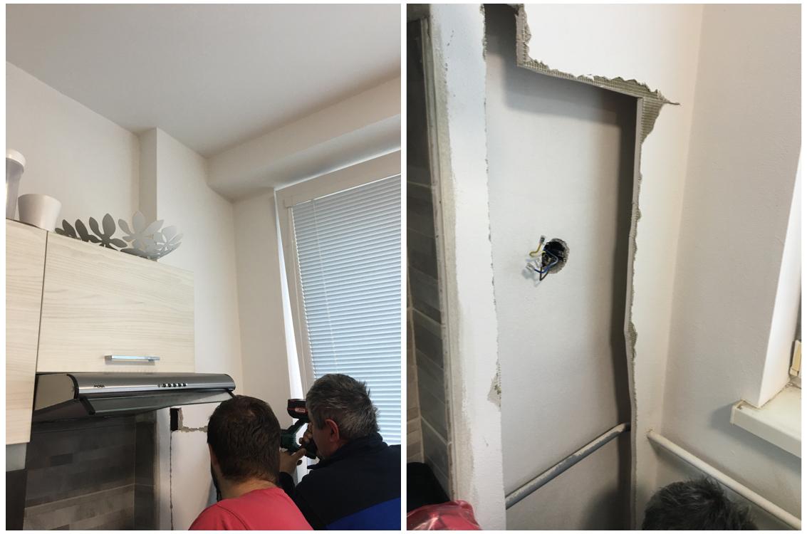 Aktuálne je to trochu inak, je tam linka. Trčiace káble v strede steny je napojené svetlo pod linkou, na kraji digestor. Na stĺpe je zásuvka. Ďalšie zásuvky aktuálne - trojzásuvka úplne vľavo, výškovo v strede steny, plus 3 vypínače na svetlo na tomto mieste. Nad zemou vľavo zásuvka, ďalšia na fotke ešte nie je je takmer v právo pri stĺpe, to čo vidno na foto je (ak sa nemýlim) trojfázovým kábel na 400V carnú dosku.