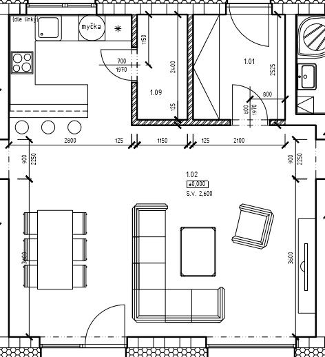tak aby bylo praktické. Je možné ještě hýbat i s příčkami špajzky a je nám jedno zda bude trouba pod deskou nebo ve vysoké skříňce. Lednice je volně stojící. Zatím bez myčky, mám ale nepoužívám, jen pro ni pro případnou budoucí instalaci v domě plánuji taky místo. Tedy odkapávač u dřezu je nutnost.
