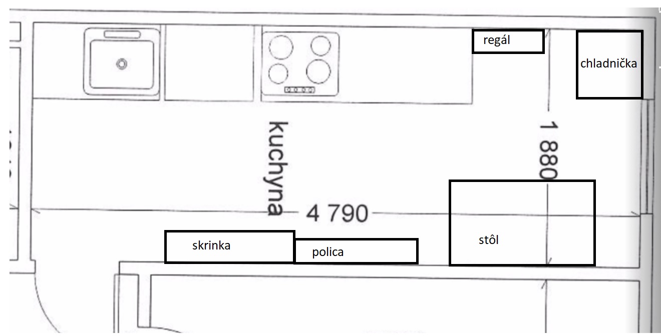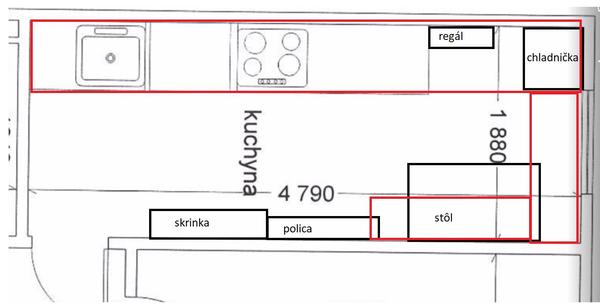 toto cervenym by bola linka, ako pise @silvusik353 a pod oknom + na protilahlej stene Lko ako pult (pripadne pod oknom aj skrinky). neviem jak vyriesit potom ten roh - kde je teraz chladnicka, tam asi police/skrinky? a chladnicka od nej dolava a dalej vstavana rura + mikro