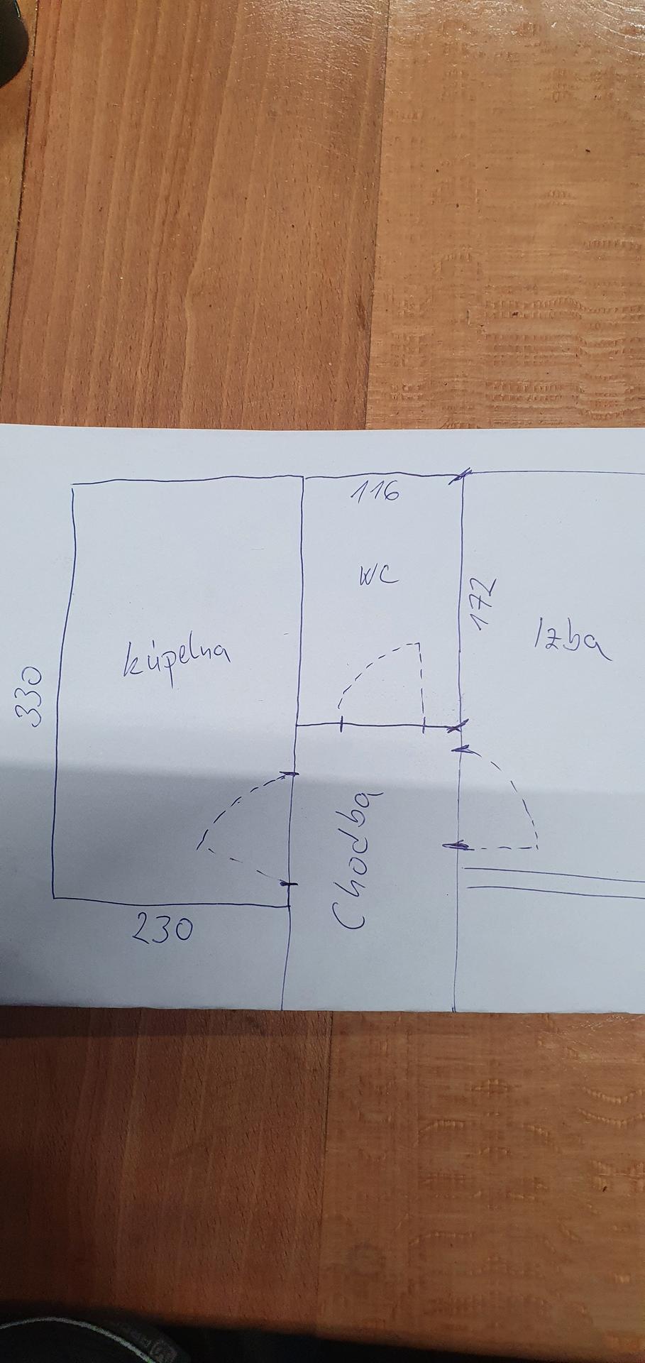 Zdravim vas, idem si po radu. Pridavam aktualny podorys, tak ako je to. Napadla ma varianta z wc ka urobit velky sprchovy a vlastne komplet to poprehazdovat. Co si myslite o nazore ze dvere na wc zastavit urobit ,,za rohom,, velky sprchovy kut a do povodnej kupelne nahadzat vanu, wc, umyvadlo atd? Wcko mi pride zbytocne velke a kupelna mala nato aby tam bol aj slusny sprchovy a vana. Dakujem za nazory