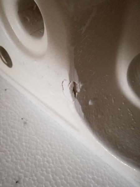 zakúpil som v kúpelňovom štúdiu sanitu (Ideal Standard Mia) a iné veci do kúpelní a po rozbalení som zistil že na oboch misách sú praskliny v miestach ktoré po montáži nebude vidieť. Tiež je v jednom kuse diera vyplnená nejakou zmesou. Zaujíma ma, či je toto štandard a nemám tomu prikladať pozornosť, alebo je to na reklamáciu. Prikladám fotografie.