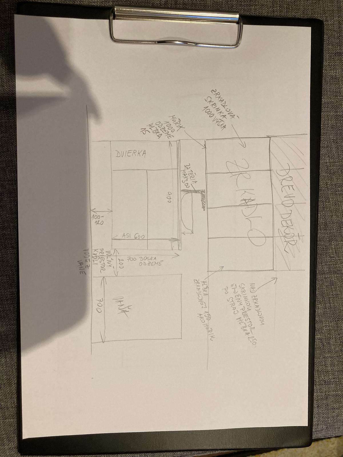 este otazka neviem ci je vidiet z mojho nakreslu rozmery vysky skrinky a baterie (nacrt ceruzkou) ci som to dobre rozpocitala. na vizualizacii mam murik vysoky 120 co je vela kedze mam 155. ja som to rozpocitala na 1m murik a mad nim uz ta zrkadlova skrinka. len ci stojankova bateria nebude branit v otvarani skrinky nad nou- bateriu som ratala max 30cm a aj to planujem najst mensiu kedze mne sa tie vysokanske nepacia.