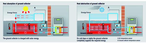 @culdo Uvažoval som nad niečím podobným. Na obrázku je schéma zapojenia a princíp fungovania s tepelným čerpadlom. Namiesto plota - nadzemnej časti by mohol byť trubicový solárny kolektor. A tepelné čerpadlo Zem - voda. Pricíp je ten istý - akumulovanie solárnej energie v čase jej prebytku, zemný kolektor v tomto prípade môže byť len jedna tretina plochy bez solárneho dobíjania. a može byť hlbší, viacvrstvový.