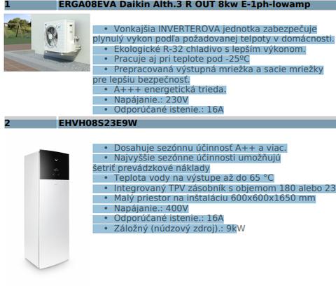 Účinnosť podľa papierov je vyššia u toho Buderusu, aj keď používa staršie, čoskoro zakázané chladivo. Čo bude asi tým že je to monoblok. Viď fotky technických listov, všimnite si hlavne COP pri -7 °C. Mám toho Daikina a môžem povedať že vonkajšia jednotka je tichá, vnútorná tiež (ale to som trochu znížil otáčky obehového čerpadla).