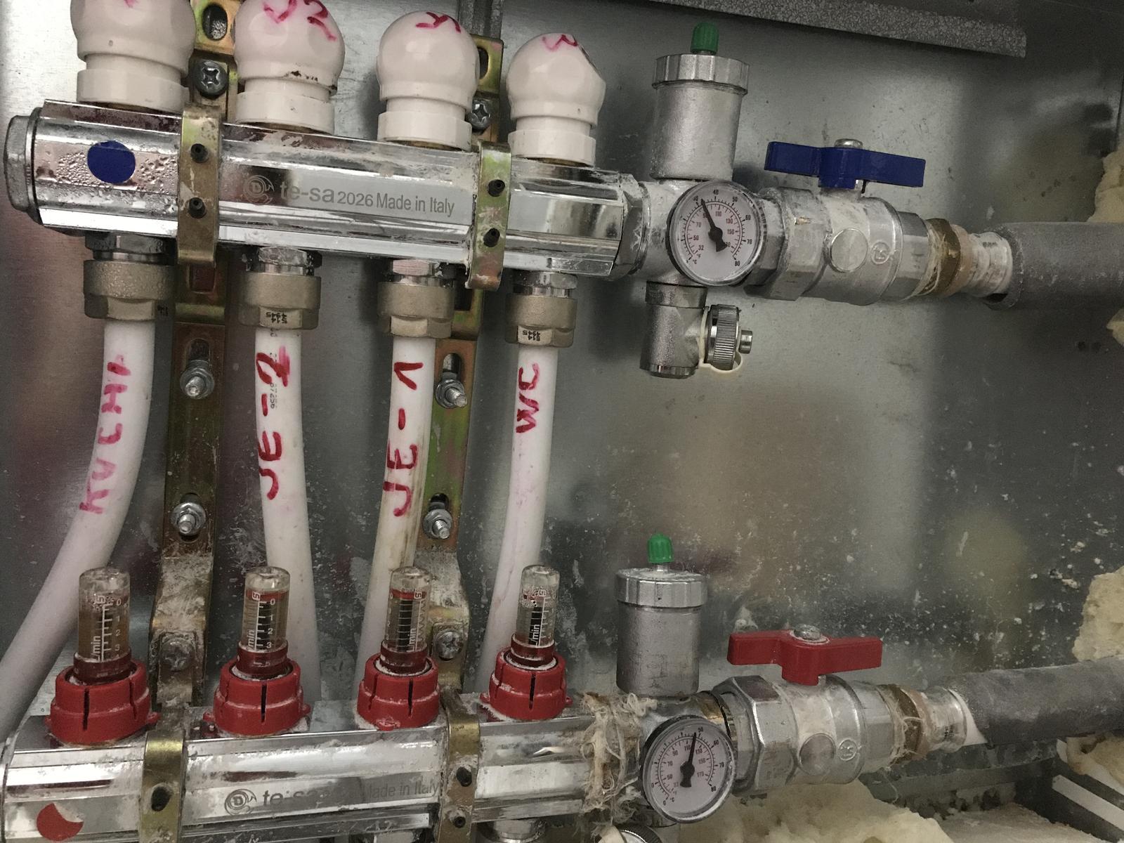 treba skontrolovať rozdeľovač podlahového kúrenia. či nie je zatvorený niektorý z prívodov či odvodov resp. či nie sú zatvorené samostatne každá vetva.