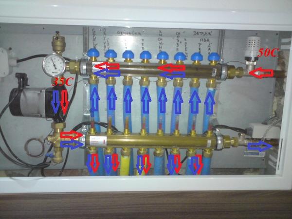 Chcem sa poradiť. Na foto je moj rozdelovač podlahového kúrenia. Nezda sa mi zapojenie čerpadla. Problem je vtom ze na privode do rozdelovača mam 50 stupnov ale nasledne zo spiatočky bez možnosti regulacie mi hned ochladzuje vodu na cca 35 stupnov. Takato ochladena potom ide do podlahy. Poradte akou prestavbou systemu dosiahnem moznost regulacie zmiešavania studenej spiatocky s privodom. Na fotke som označil šipkami systém miešania vody, aspoň si myslím že takto to funguje. Premýšlal som aj o vymontovaní prídavneho čerpadla ale neviem či sam kotol to utiahne. Mám Attack KTP plus 7 rozvodov. Jeden rozvod max do 100m.