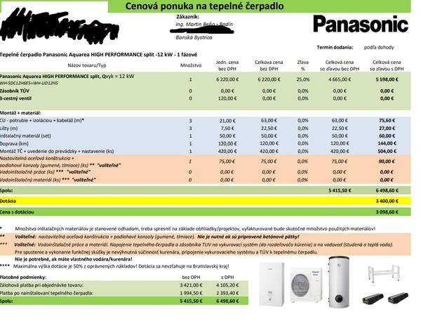 ja som dnes naceňoval Panasonic. Aj 9kW aj 12kW s dotáciou a inštaláciou vyšli jemne cez 3000€. Za technológiu, inštaláciu, bez zásobníka vody a bez vodárčiny. Je to presne rovnaká cena ako ako sa bežne berie za inštaláciu plynového kotla. V prípade dotácií už nemá zmysel ani robiť prípojku, teda ani keď je plyn v dosahu. Jediná nevýhoda, že sa tak dlho momentálne na dotácie čaká.