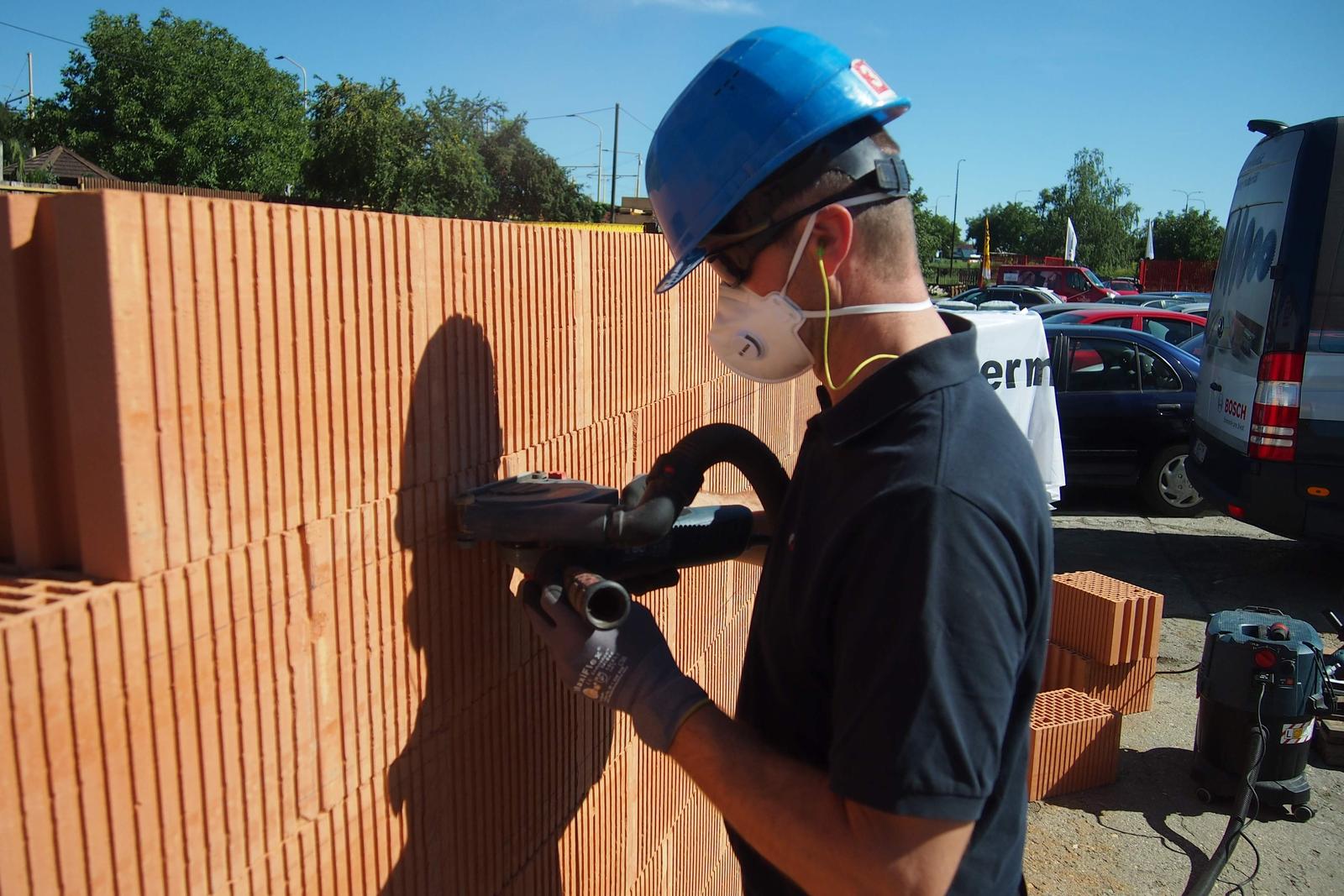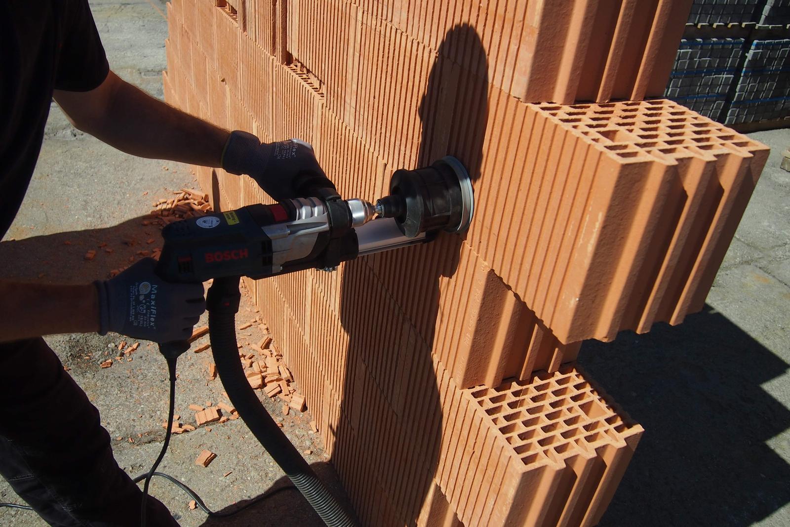O ťaaažkom drážkovaní, vŕtaní, rezaní tehál som toho počul toľko, že počas prezentačných akcií Raňajky s Wienerbergerom sme s aplikačným technikom Jozefom zo spoločnosti Bosch "vymurovali" stenu z Porotherm 30 Profi BEZdryfix :-) (Teda, nasucho, aby tam neostala naveky) a rozhodli sme sa vyskúšať a presvedčiť sa na vlastnej koži, my (teda ja) technici teoretici, ako sa do tehly reže, vŕta, frézuje. Je to ako so všetkým, ak používate vhodné na to určené nástroje resp. drobnú ručnú mechanizáciu, ide to jedna radosť. Len na to treba byť vhodne oblečený :-) Výsledok nie je tak závislý od značky, akú používate, skôr zručnosť, s akou to robíte. Alebo najskôr - ak len si dáte len trocha záležať - tak výsledok je ok. Popri spomínanom videu https://www.youtube.com/watch?v=HhSq8... pripájam menší fotopríbeh.
